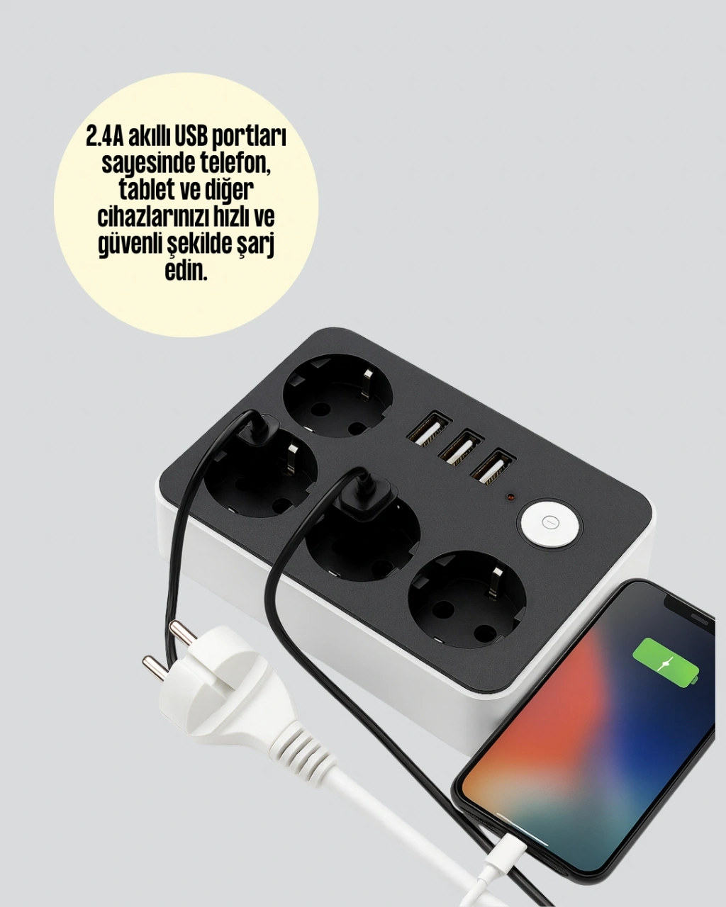 Tek bir prizle hem güvenliği hem de hızlı şarjı bir araya getiren bu ürün, 4 adet priz ve 3 USB portu sayesinde aynı anda 7 cihazınızı çalıştırabilmenize olanak tanır. 4.1A hızlı şarj özelliği, telefon ve tabletlerinizi kısa sürede şarj etmenizi sağlar. Akım koruma teknolojisi ile cihazlarınızı yüksek voltaj ve elektrik dalgalanmalarına karşı güvenle kullanabilirsiniz. 2 metre kablo uzunluğu, kullanım alanında size esneklik sunar. 2500W güce kadar destek sağlayan bu priz, yüksek performansı ile öne çıkar. Üzerinde yer alan açma-kapama anahtarı sayesinde kullanılmadığında enerjiyi kesebilir, güvenlik ve enerji tasarrufu sağlayabilirsiniz. Kompakt tasarımı sayesinde fazla yer kaplamaz, taşınabilir yapısı ile seyahatlerde de rahatlıkla kullanılabilir. Modern ve işlevsel tasarımı ile evinizin veya ofisinizin vazgeçilmez bir parçası olacak bu priz, günlük yaşamda güvenilir ve pratik bir çözüm sunar.