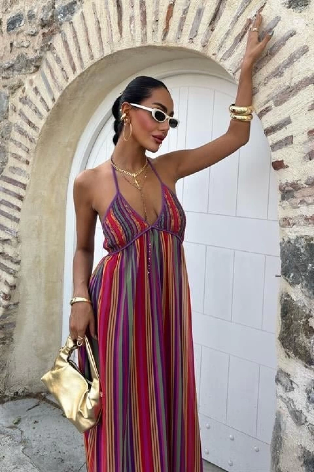 Askılı Pile Detaylı Renkli Maxi Elbise 2748