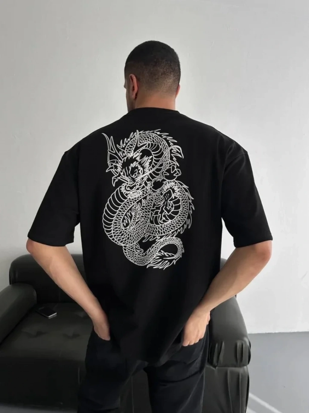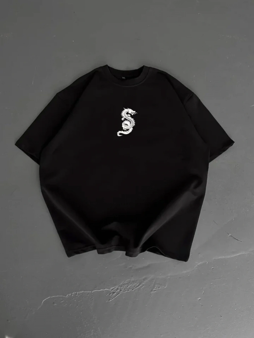 Baskılı Oversize Bisiklet Yaka T-shirt - Siyah