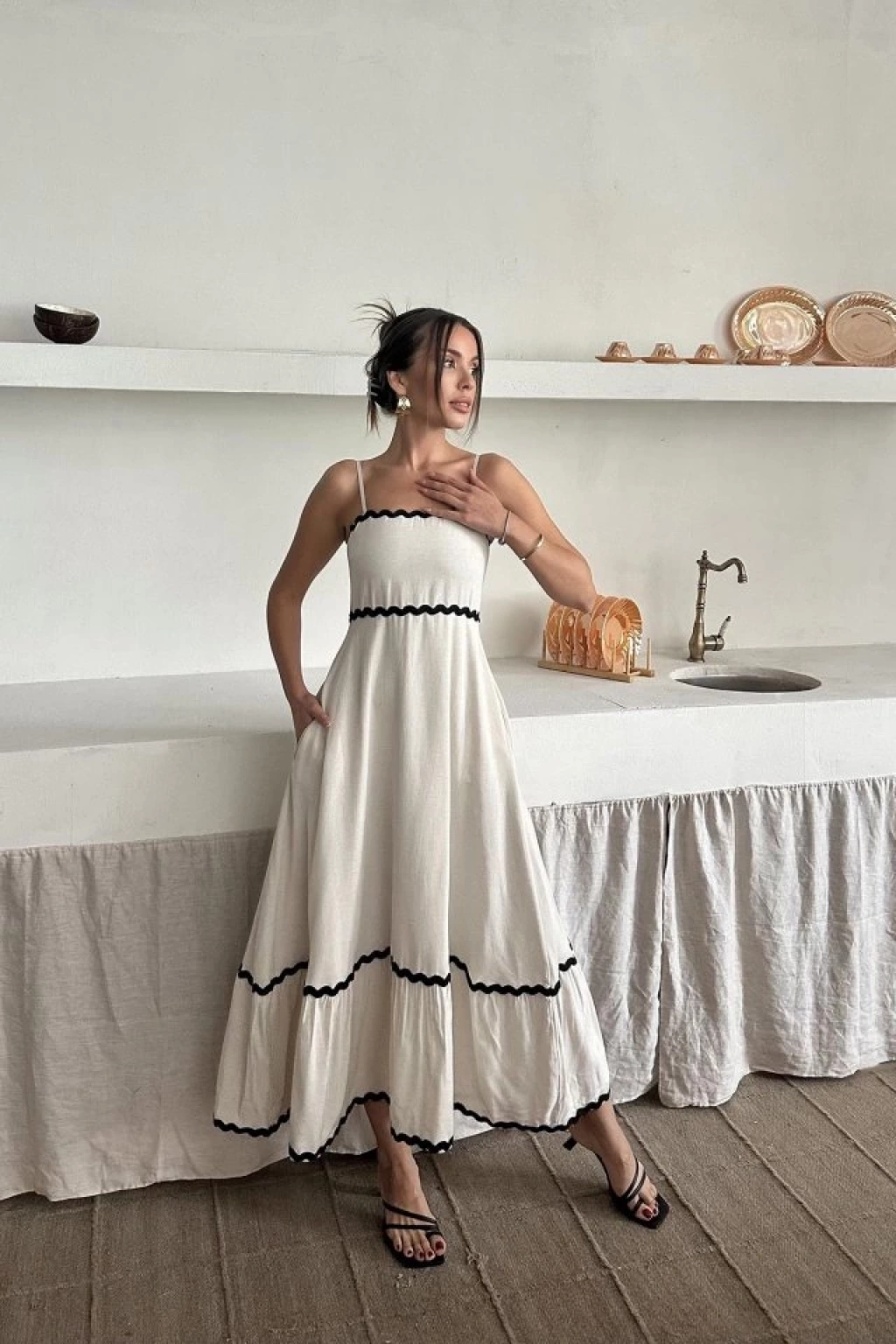 Bej Şerit Detay Keten Elbise