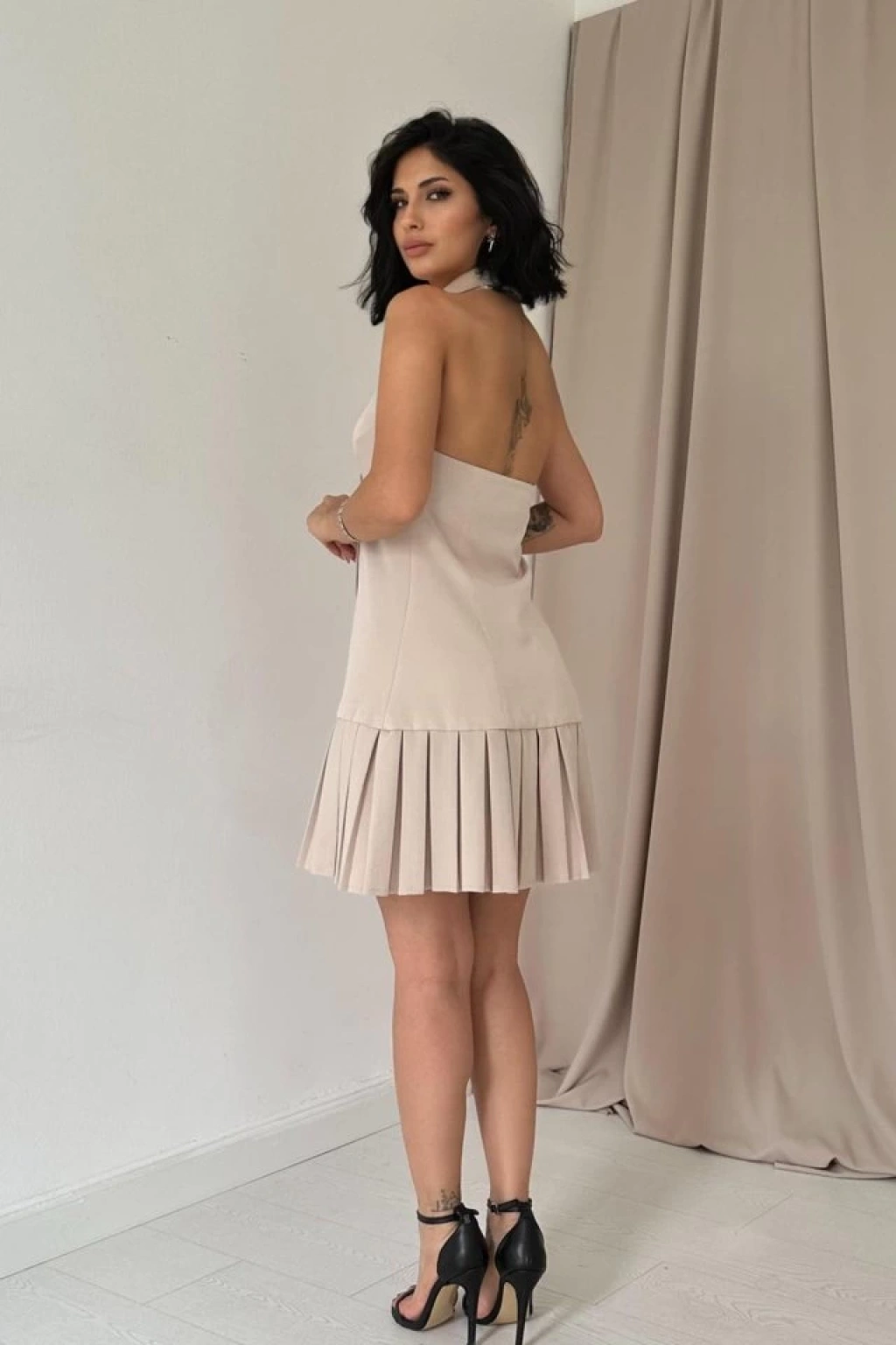 Bej Sırtı Açık Ceket Yakalı Elbise