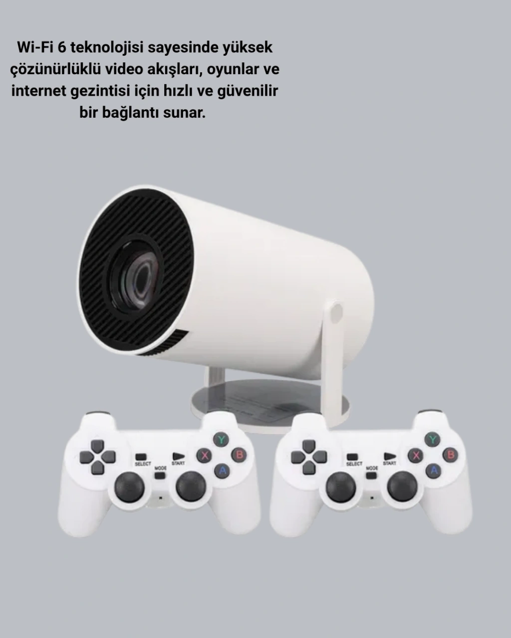 Bluetooth 5.0 ve Wi-Fi 6 destekli bu 4K projeksiyon cihazı, kablosuz bağlantı kolaylığı ve üstün görüntü kalitesiyle dikkat çeker. Wi-Fi 6 teknolojisi, yüksek hızda veri aktarımıyla videoların donmadan akmasını sağlar; Bluetooth 5.0 bağlantısı ise kablosuz hoparlör veya kulaklıklarla güçlü bir ses deneyimi sunar.4K çözünürlük desteği, sinema kalitesinde netlik sunarken çift kollu ayarlanabilir tasarım, görüntüyü dilediğiniz açıda konumlandırmanıza olanak tanır. HDMI, USB ve AUX girişleri sayesinde bilgisayar, telefon, tablet veya oyun konsolu gibi farklı cihazlarla kolayca bağlantı kurabilirsiniz.Oyunseverler için geliştirilen bu model, 10.000’den fazla oyun desteğiyle sınırsız eğlence imkânı sunar. Ayrıca, 4.000’den fazla uygulama desteğiyle film, müzik, eğitim ve sosyal medya platformlarına kolay erişim sağlar.Ekran yansıtma özelliği, mobil cihazınızdaki içeriği kablosuz olarak büyük ekrana taşımanıza olanak tanır. Hafif ve taşınabilir yapısı, evde, ofiste veya dış mekanlarda pratik kullanım imkânı sağlar.Modern tasarımı, güçlü bağlantı teknolojileri ve üstün görüntü kalitesiyle bu projeksiyon cihazı, multimedya deneyiminizi bir üst seviyeye taşır. Sinema, oyun ve sunum keyfini tek cihazda yaşayın!