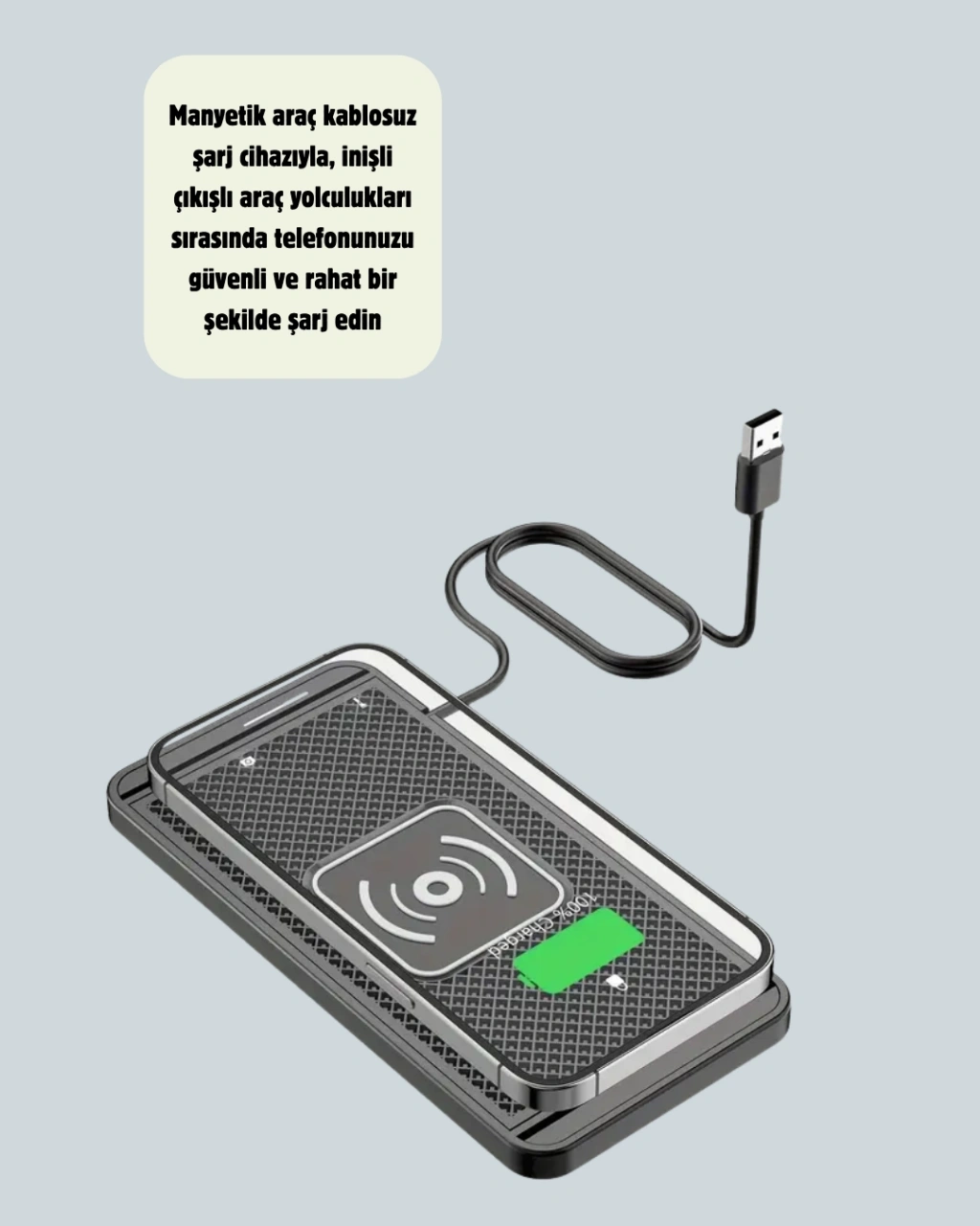 Kabloya gerek kalmadan hızlı, güvenli ve estetik bir şarj deneyimi! Bu manyetik kablosuz şarj ped, minimal tasarımı ve yüksek performansıyla dikkat çeker.Güçlü mıknatıs sistemi, telefonunuzu otomatik hizalar ve sabit bir şekilde yerinde tutar. Bu sayede sürüş sırasında bile sarsılmadan şarj etmeye devam eder.Aşırı ısınma, aşırı voltaj ve kısa devre koruması, gelişmiş güvenlik algoritmalarıyla donatılmıştır. Isı dağıtım sistemi sayesinde uzun süreli kullanımlarda bile sıcaklık kontrol altında kalır.Kaymaz silikon taban, pürüzsüz yüzeylerde bile sağlam bir kavrama sunar. Çift taraflı yapışkan aparatlar, cihazın araç konsoluna veya masaya kolayca monte edilmesini sağlar.Qi kablosuz şarj protokolü, 15W’a kadar hızlı şarj desteği sunar. iPhone, Samsung, Xiaomi, Huawei gibi cihazlarla tam uyumludur.Kompakt ve hafif yapısı, evde, ofiste, okulda veya konferanslarda taşımayı kolaylaştırır.Basit ve zarif tasarımı, modern araç içi dekorasyonla uyum sağlar.Kablo derdine elveda deyin — bu manyetik şarj pediyle hızlı, güvenli ve kablosuz şarj deneyimini her yerde yaşayın.