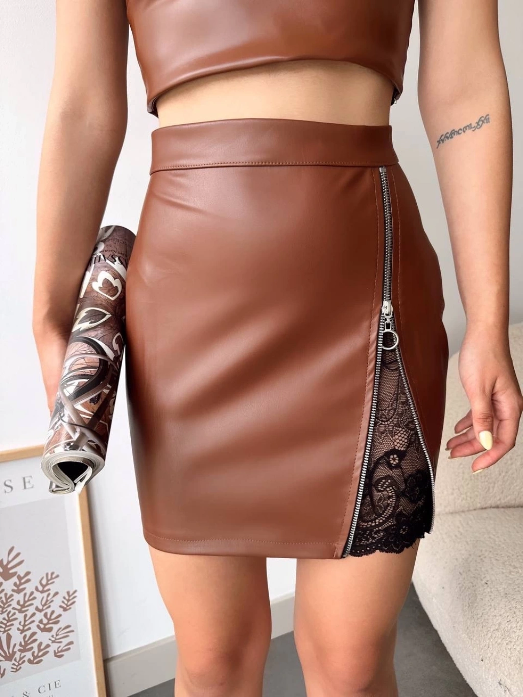 • Dantelli fermuarlı deri etek kahve w24598