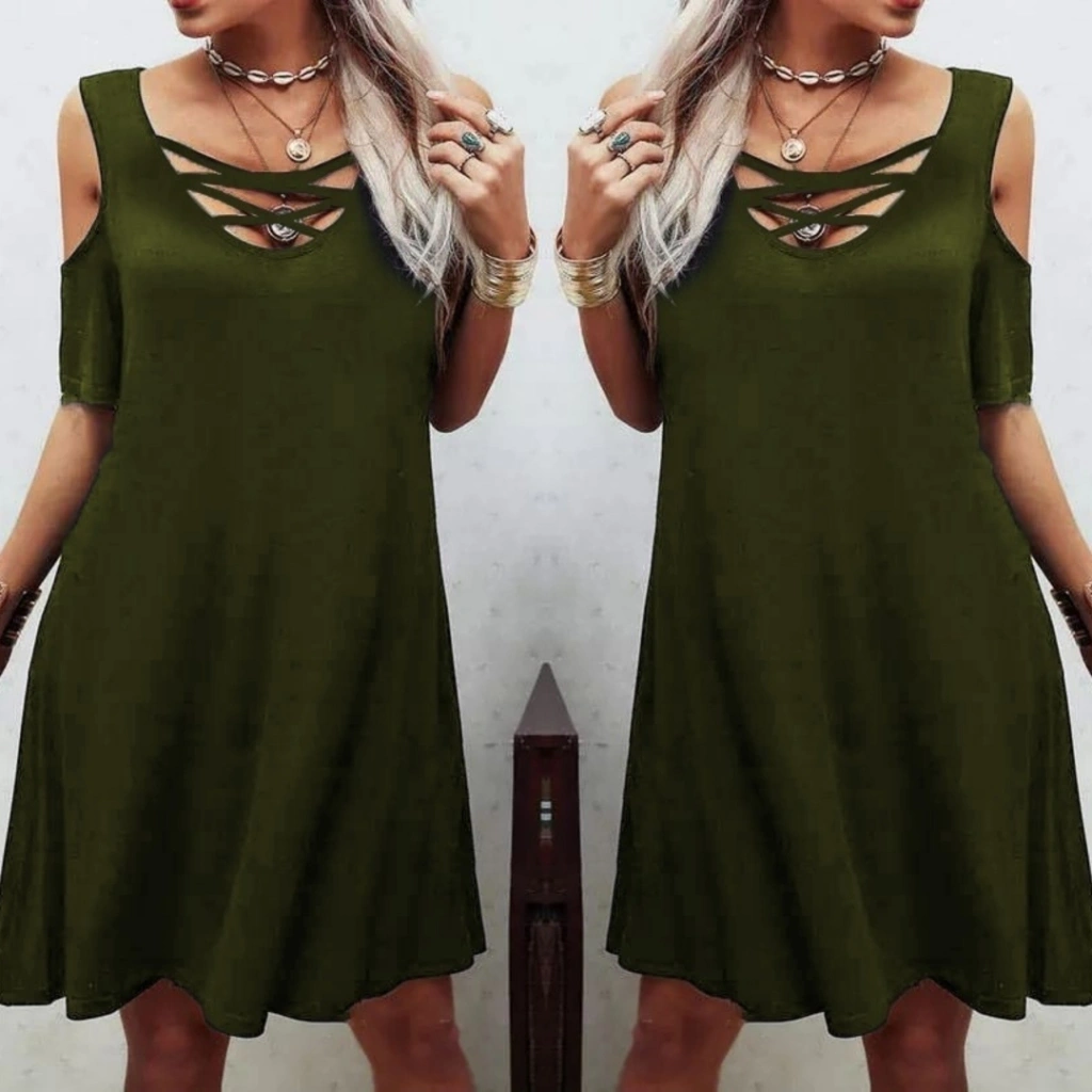 Dekolteli Bağcık Detay Viskon Kumaş Elbise