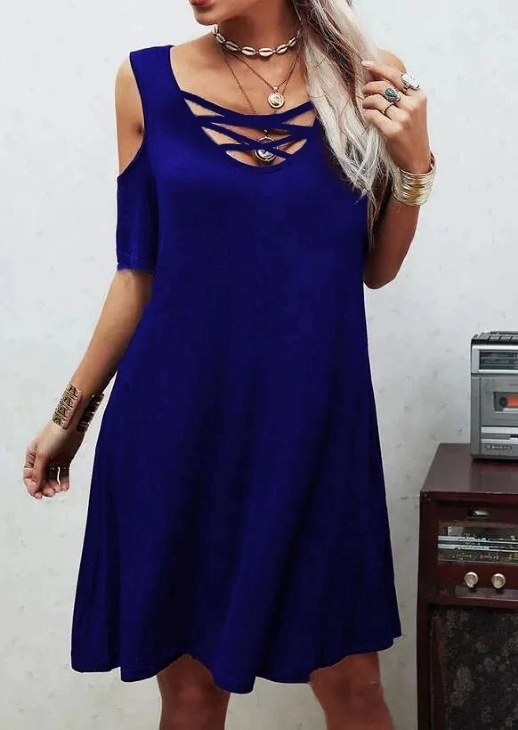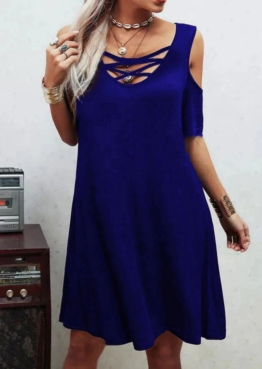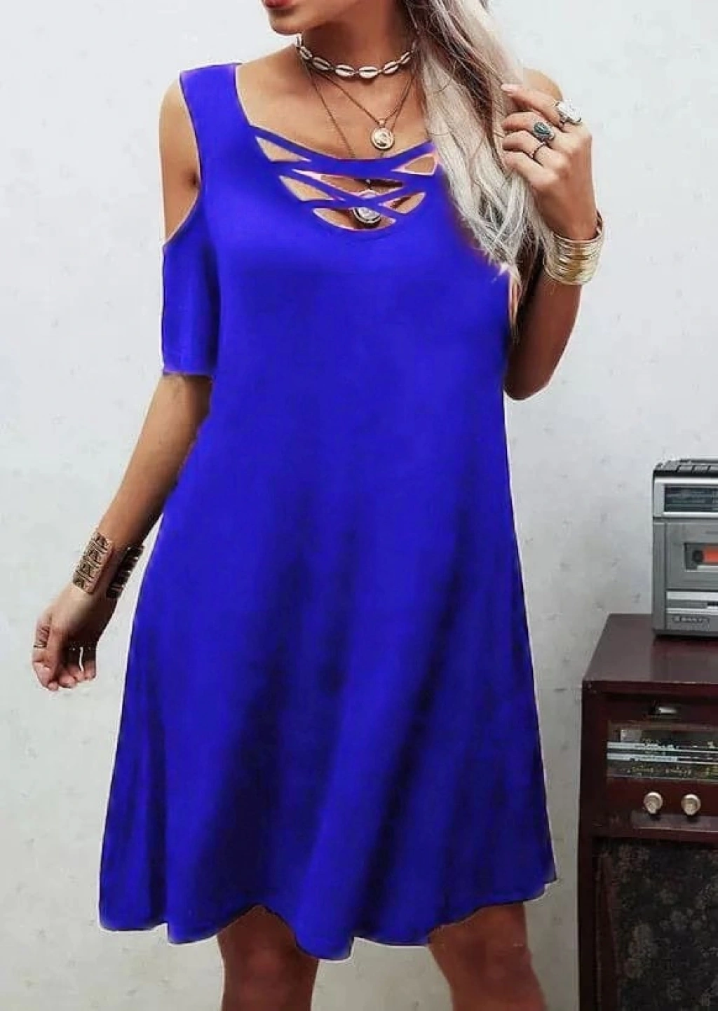 Dekolteli Bağcık Detay Viskon Kumaş Elbise