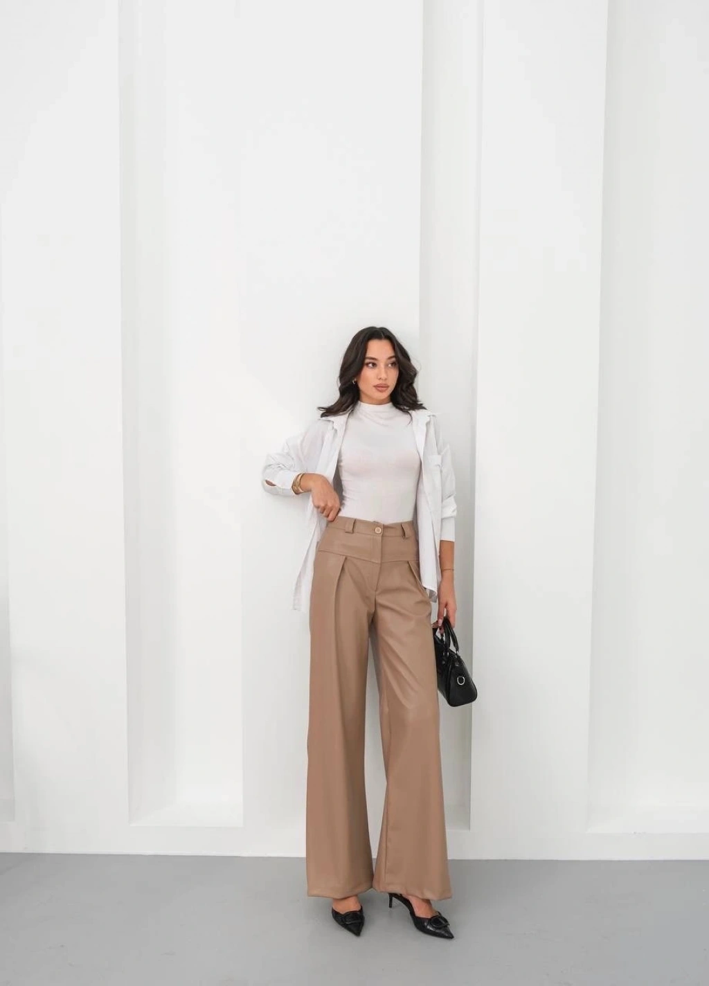 Deri geniş paça beli lastikli pantolon bej h263644, hem şık hem de rahat bir seçenektir. İşte bu pantolonun öne çıkan özellikleri: