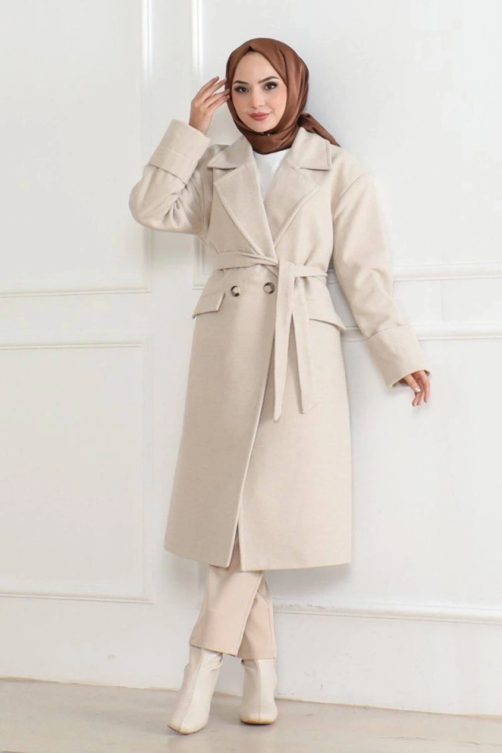 Düğmeli İçi Astarlı Kaşmir Kaşe Kaban - Bej