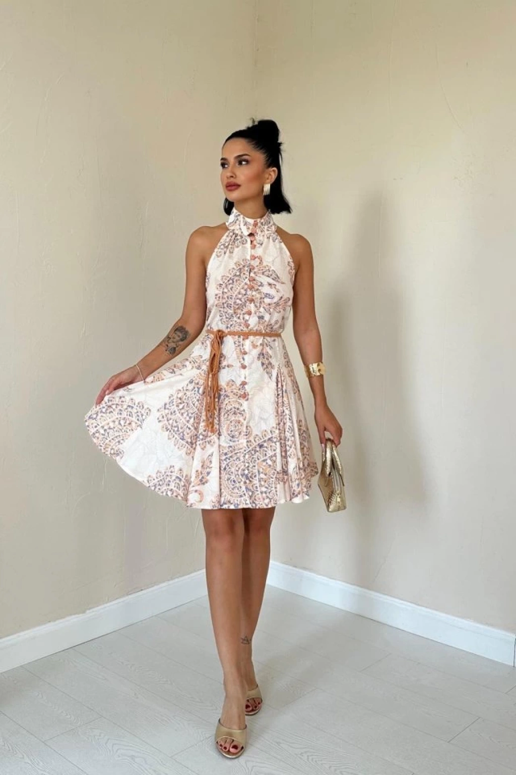 Ekru Halter Yaka Elbise