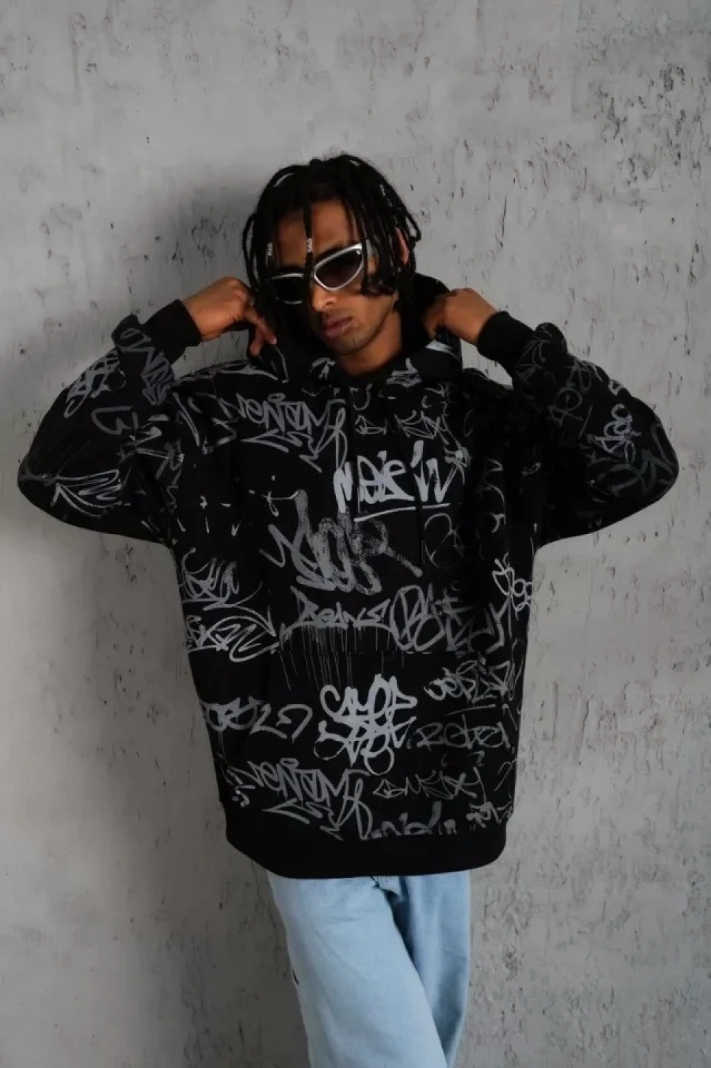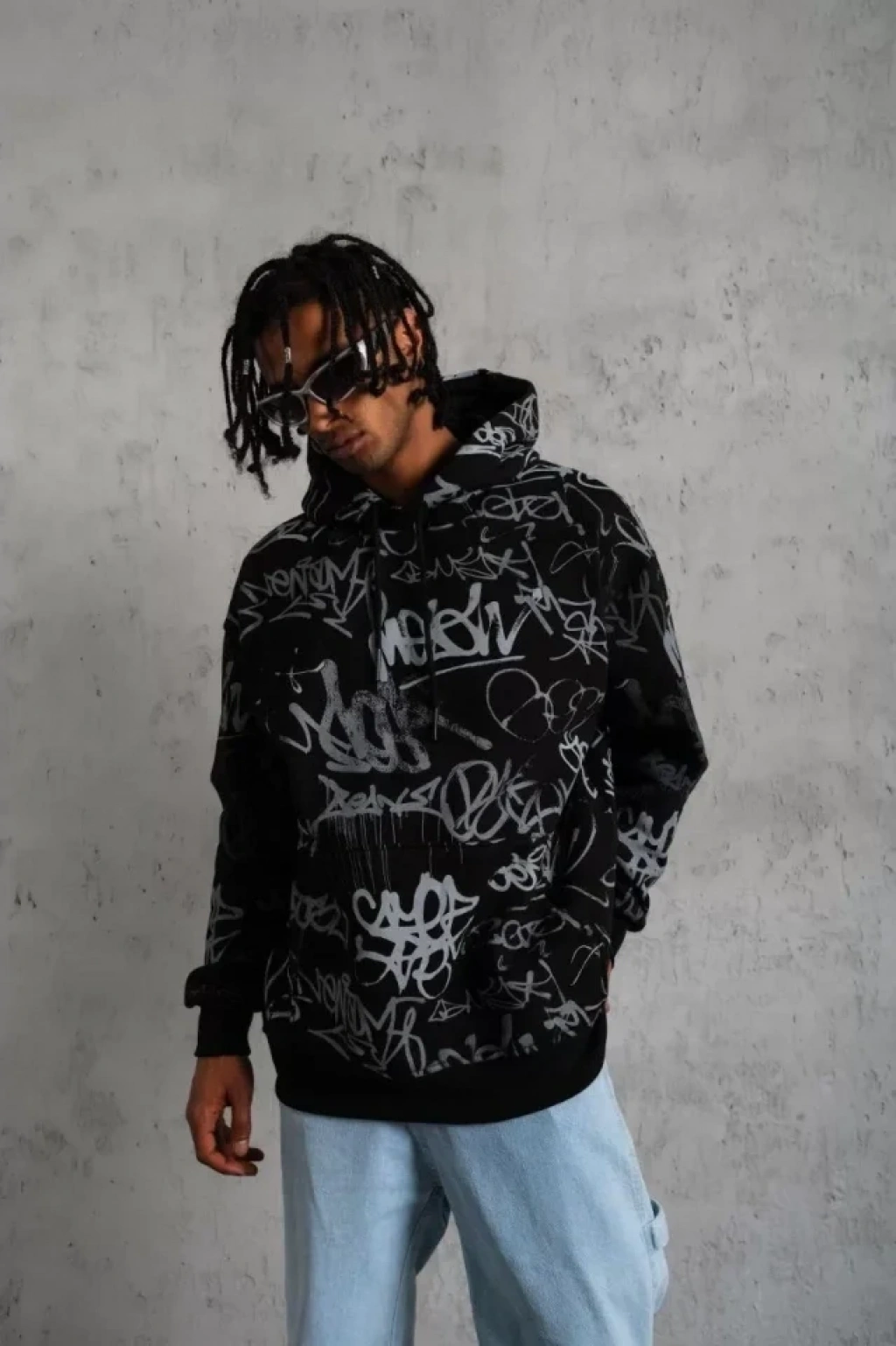 Erkek Baskılı Kapüşonlu Ribanalı Sweat - Siyah