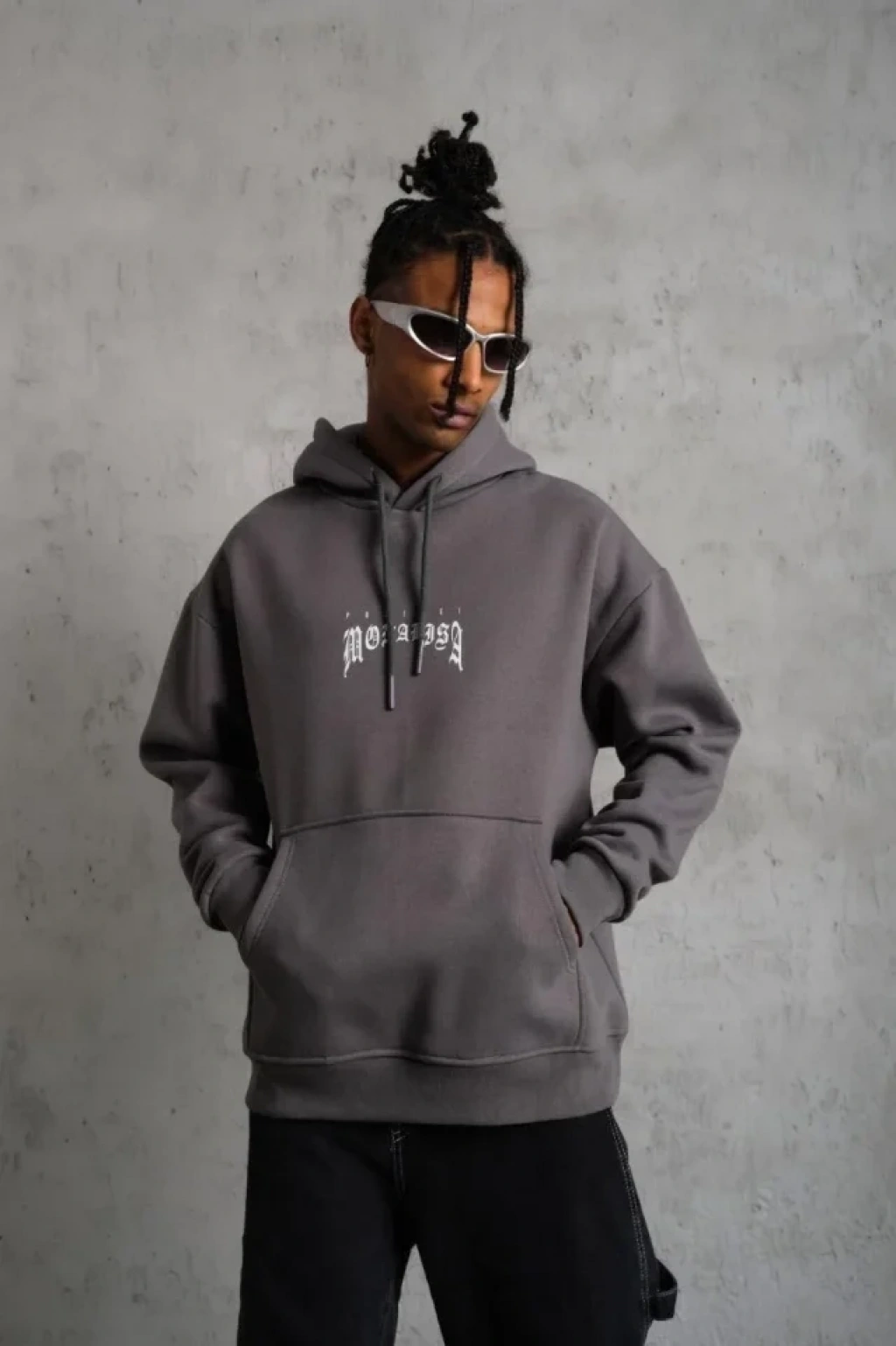 Erkek Düz Kapüşonlu Sweat - Füme