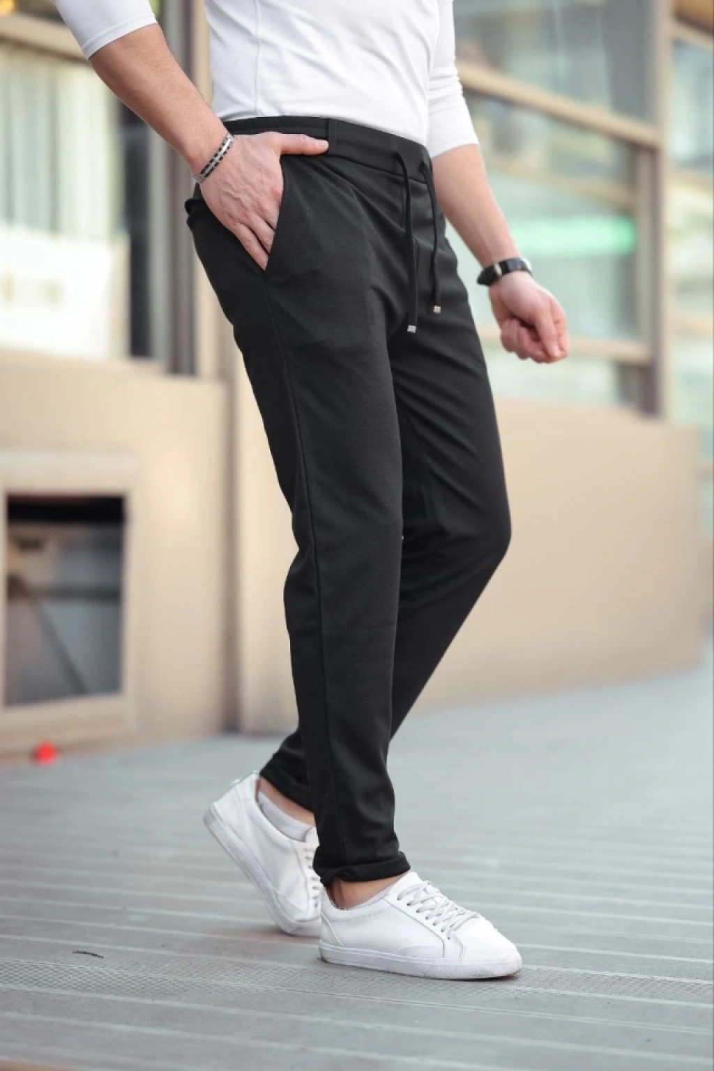 Erkek Diagonel Mikro Dokulu Cepli Beli Lastilki Pantolon - Siyah