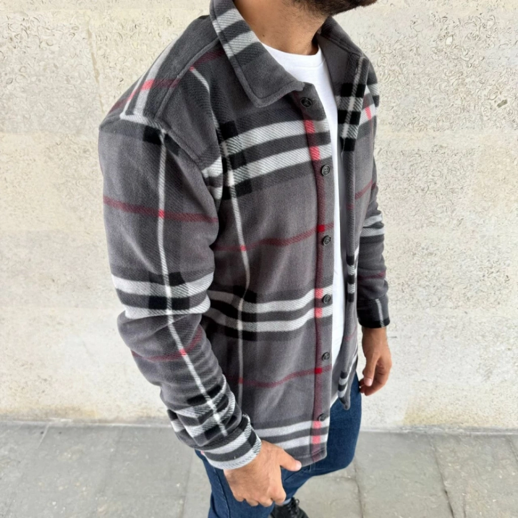 Erkek Ekose Desenli Düğmeli Polar Yakalı Uzun Kollu Gömlek Oversize Rahat Kalıp - Füme