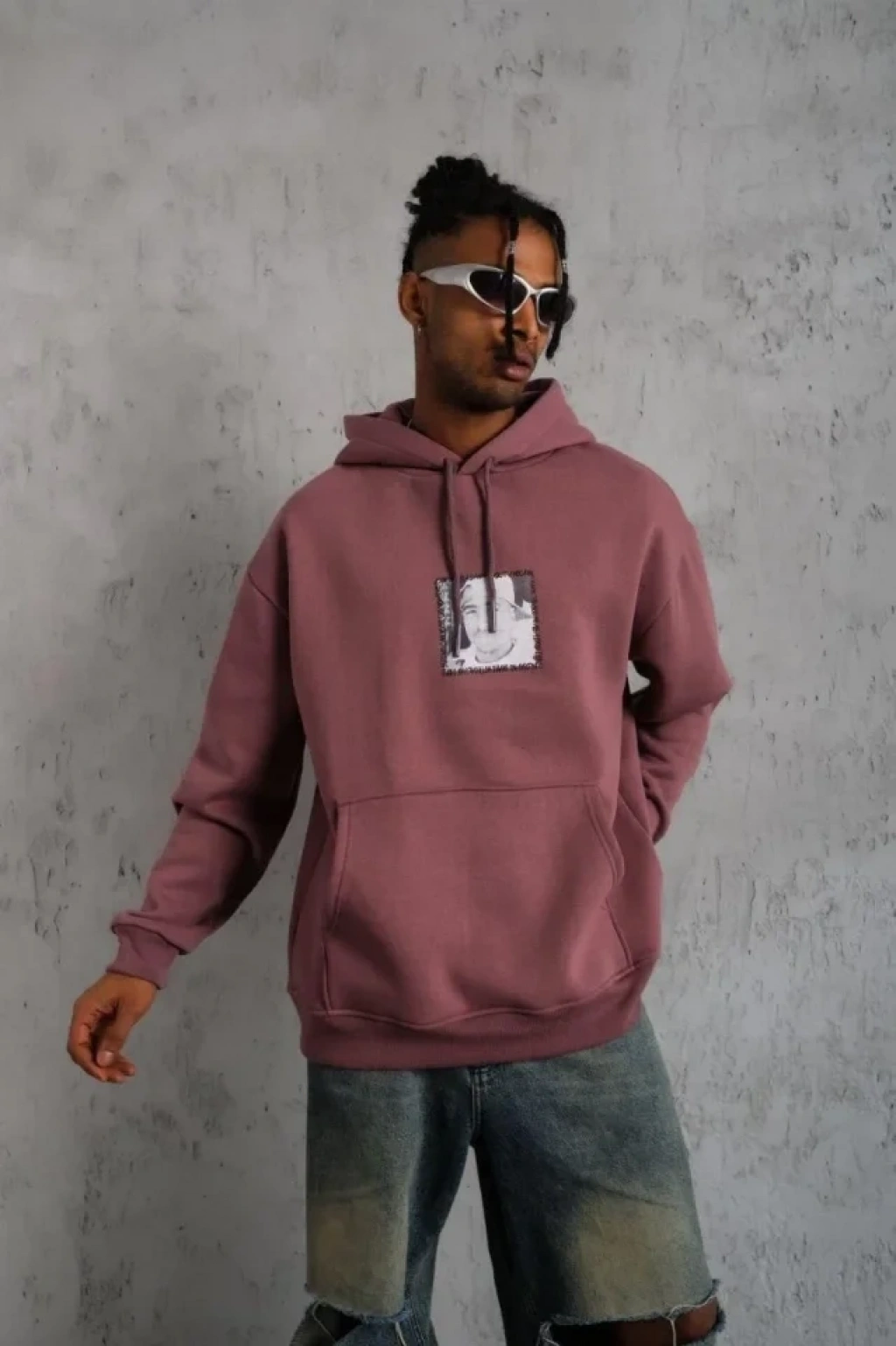 Erkek Baskılı Sweat Kapüşonlu - Gül Kurusu