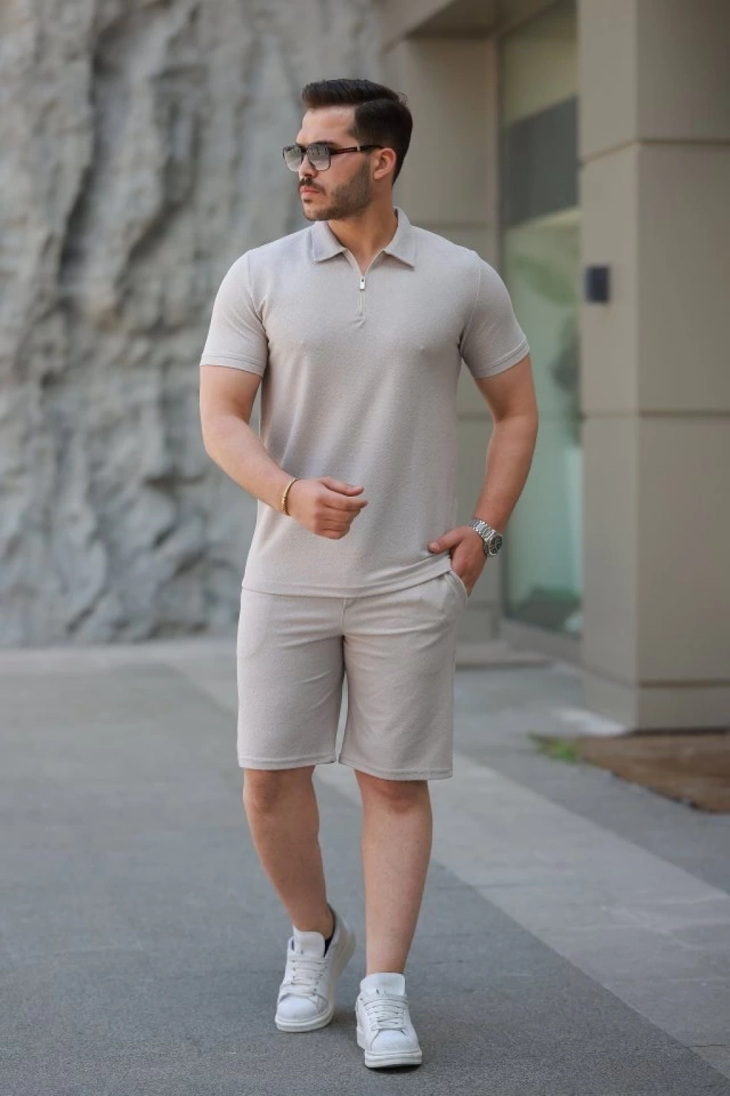 Erkek Yakalı Fermuarlı T-shirt şort Ikili Takım
