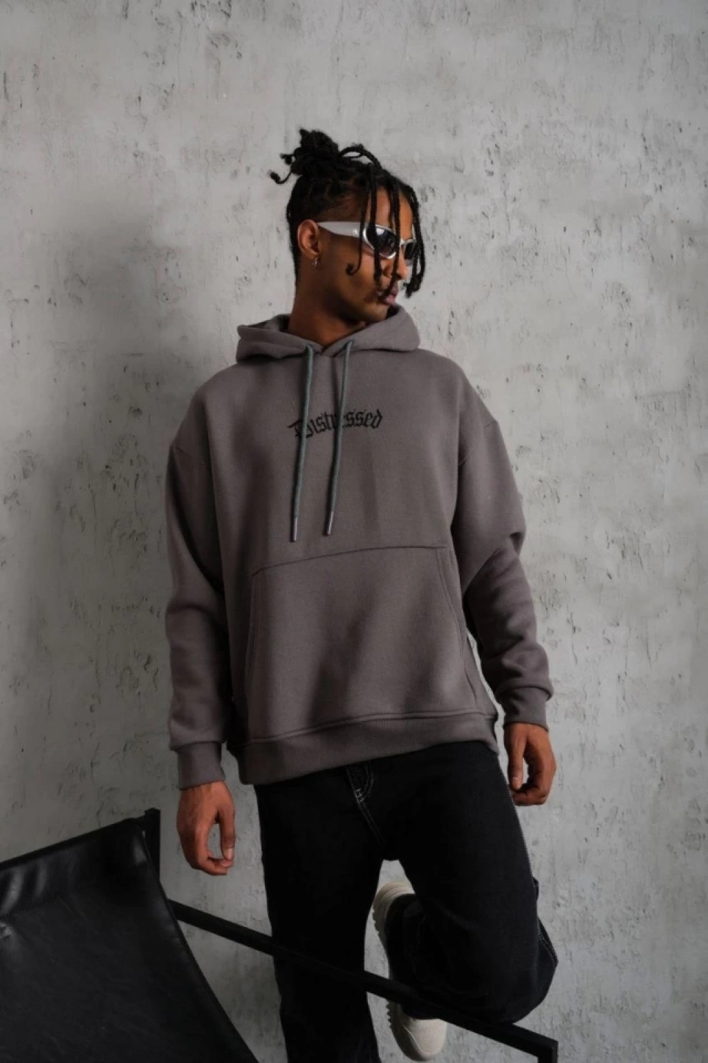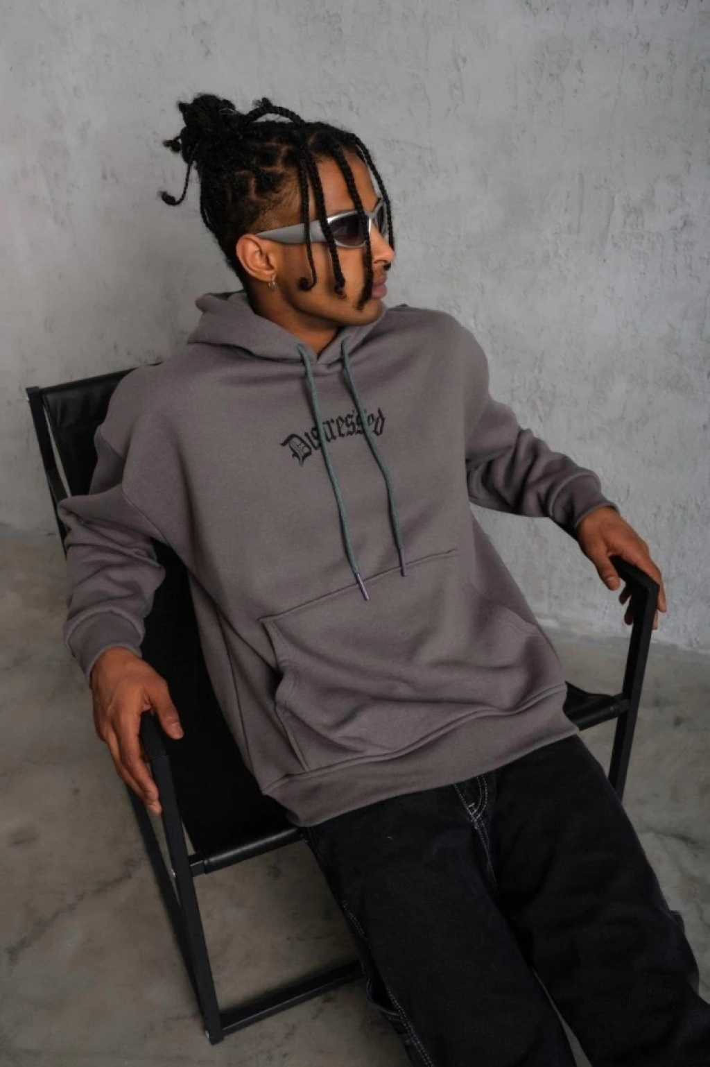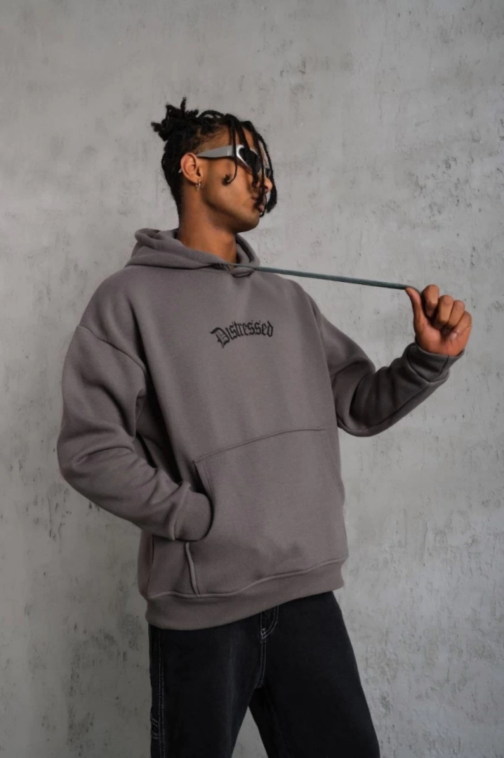 Erkek Düz Kapüşonlu Sweat - Füme