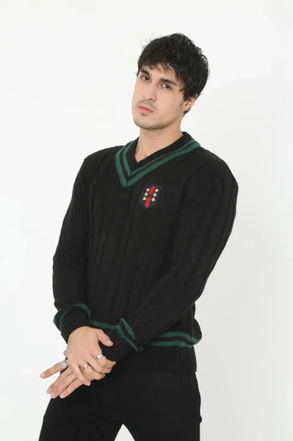Erkek V Yaka Örgülü Kazak - Siyah