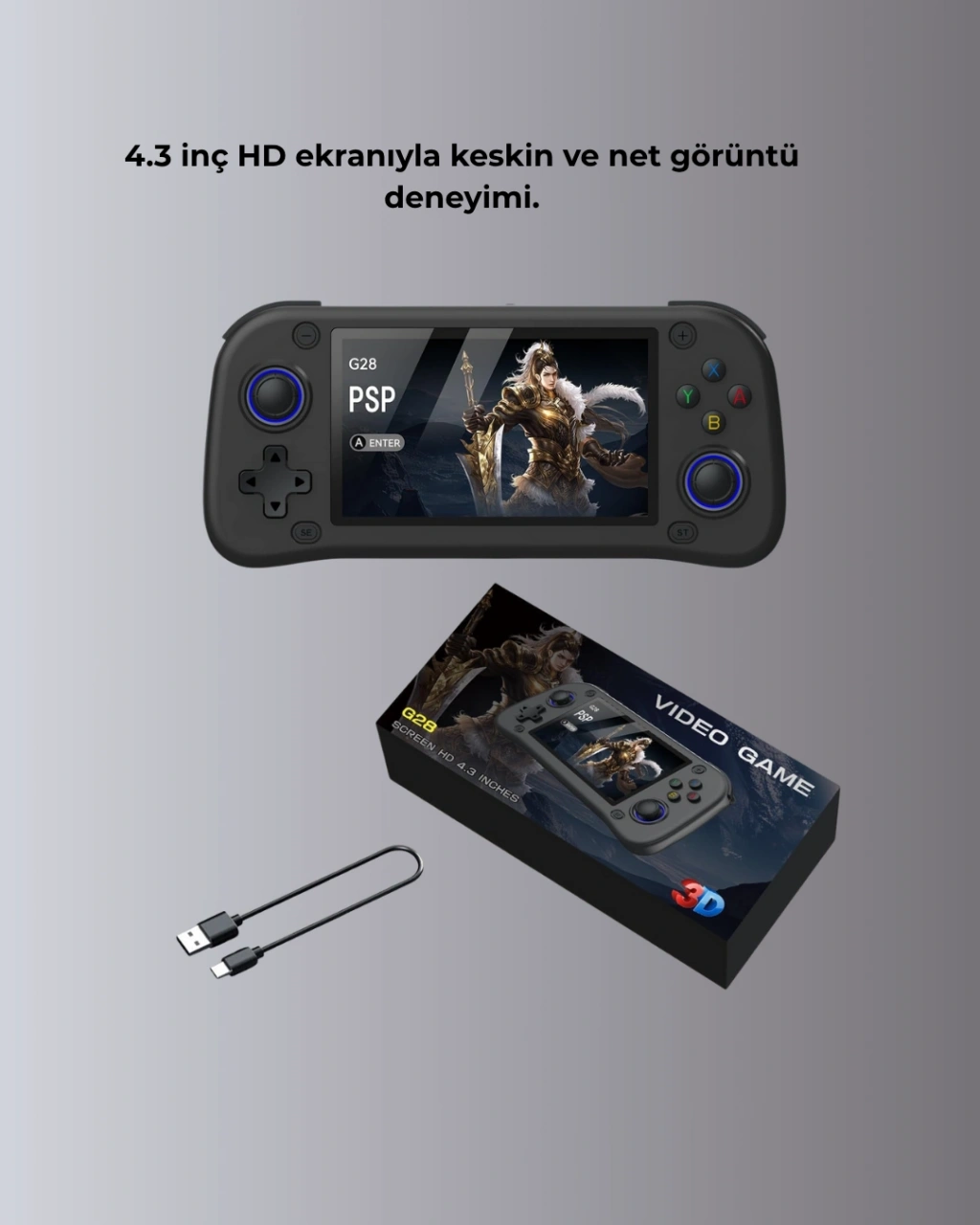 Bu taşınabilir oyun konsolu, oyun dünyasını cebinize getiriyor. 64GB hafıza kartı ve 10000 yüklü oyunla sınırsız eğlence sunar.RK3128 Cortex-A7 işlemci ve 4GB RAM ile güçlü donanım, hızlı tepki ve akıcı performans sağlar. Farklı emülatörleri desteklediği için pek çok oyun formatını açabilirsiniz.4.3 inç IPS ekran ve 640x480 çözünürlük, oyunları net ve canlı görüntülerle oynamanıza olanak tanır.Avuç içi boyutundaki taşınabilir tasarım, cihazı her yere kolayca götürmenizi sağlar. Seyahatlerde veya günlük kullanımda pratik bir çözüm sunar.Şık kutusu sayesinde sevdiklerinize verebileceğiniz hediyelik bir seçenek olarak da uygundur.