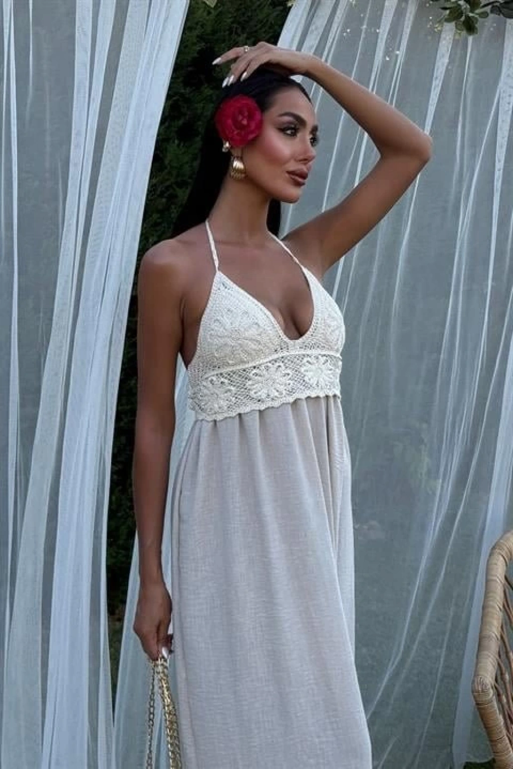 Göğsü Trikolu Keten Uzun Elbise 2904-08