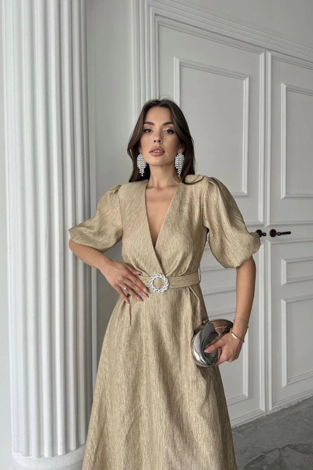 Gold Işıltılı Kemerli Kruvaze Elbise