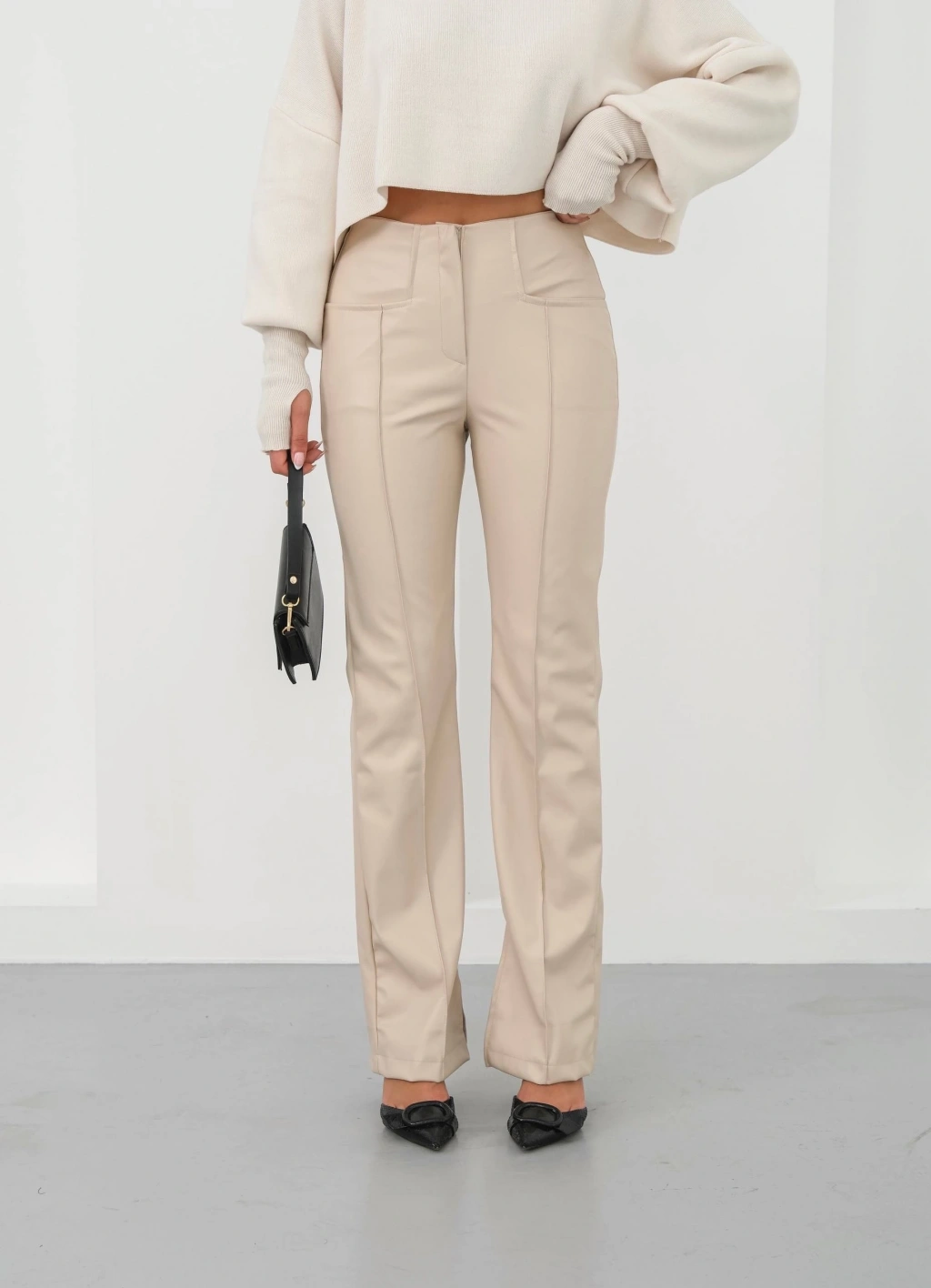 İspanyol yırtmaçlı paça deri pantolon bej hn