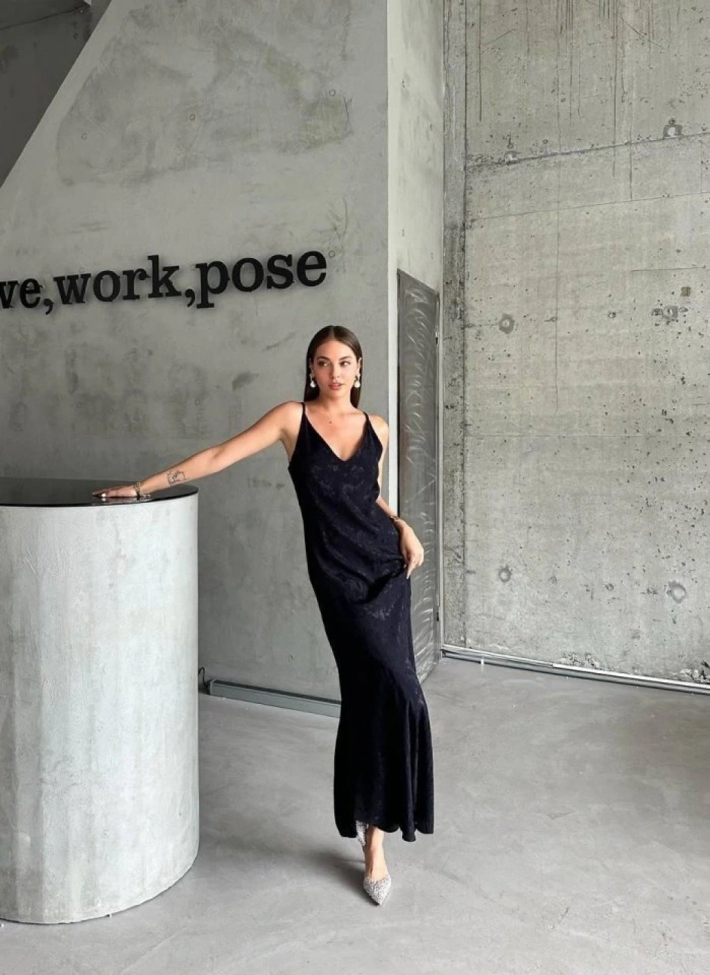 JAKARLI ASKILI SATEN ELBİSE ASİMETRİK - Siyah