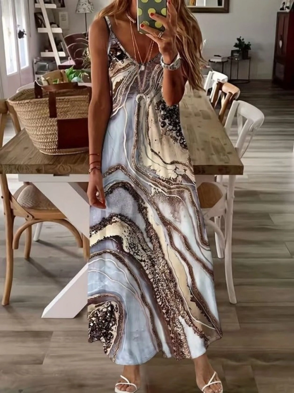 Kadın Askılı V Yakalı Desenlı Uzun Süprem Elbise