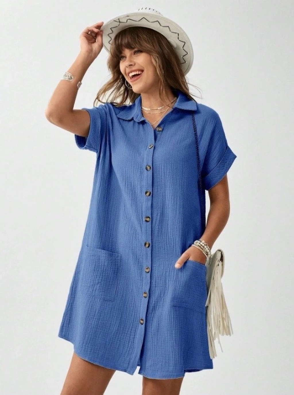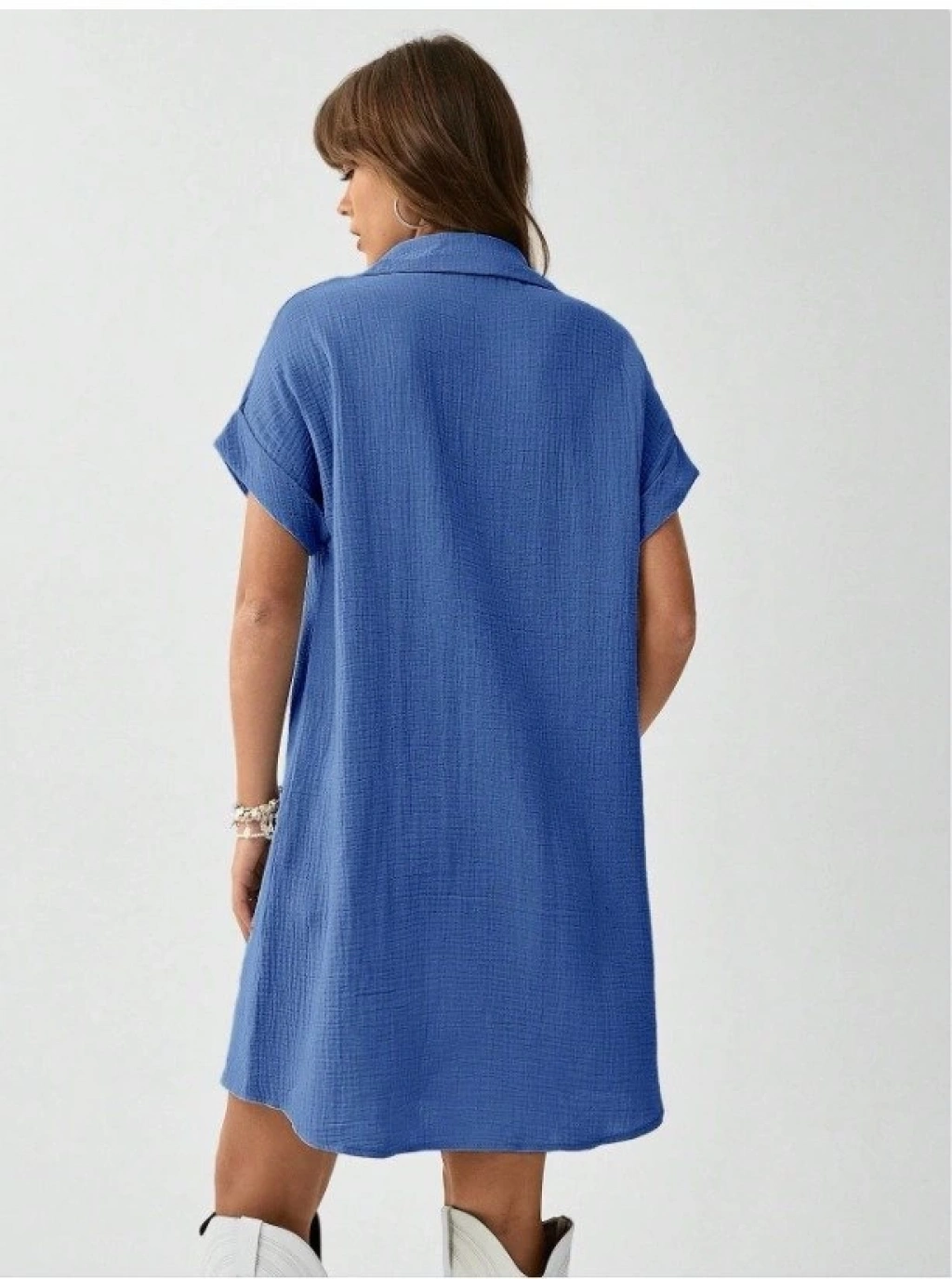 Kadın Cep Detay Müslin Kumaş Mini Gömlek Elbise