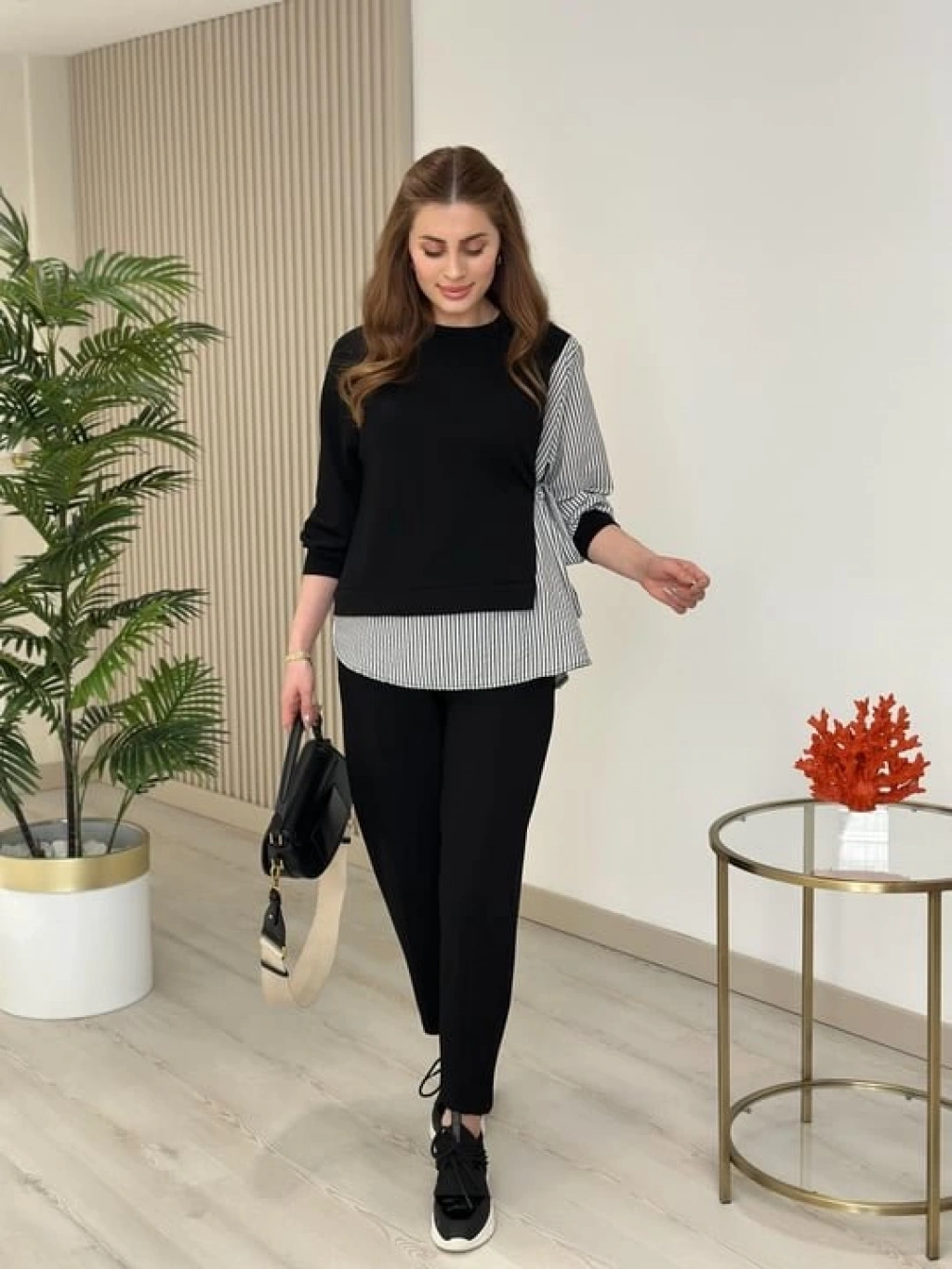 Kadın Gömlek Detay çizgili Yandan Bağlamalı Ikili Takım