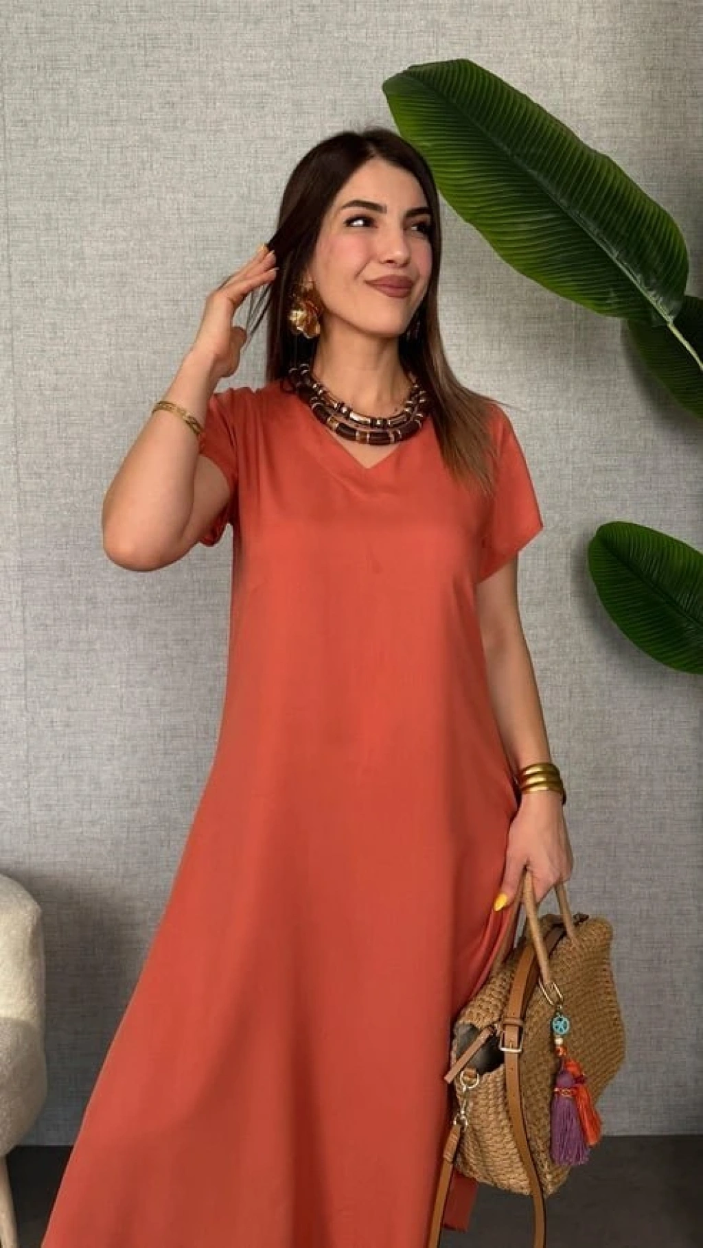 Kadın Kısa Kollu V Yaka Salaş Maxi Boy Elbise