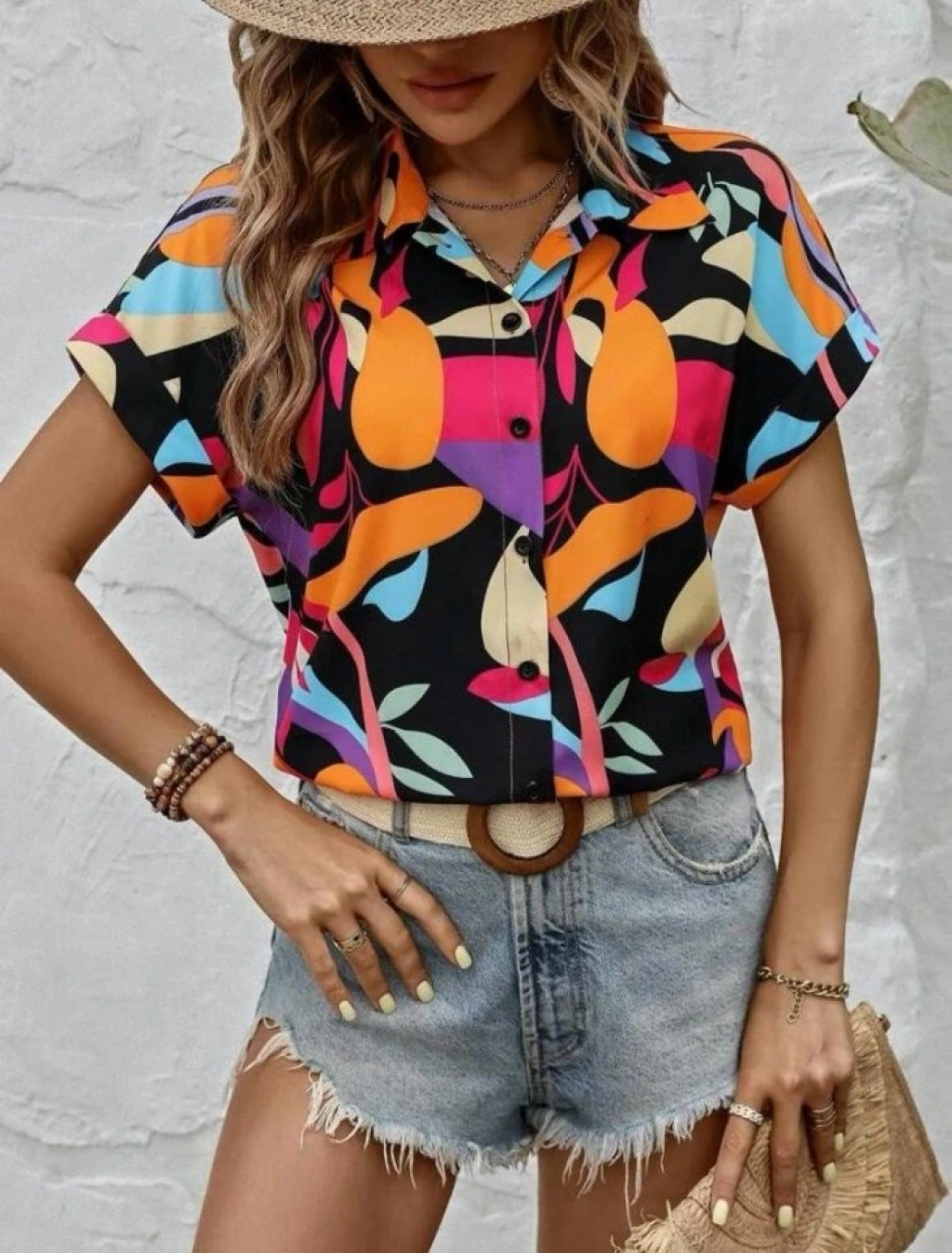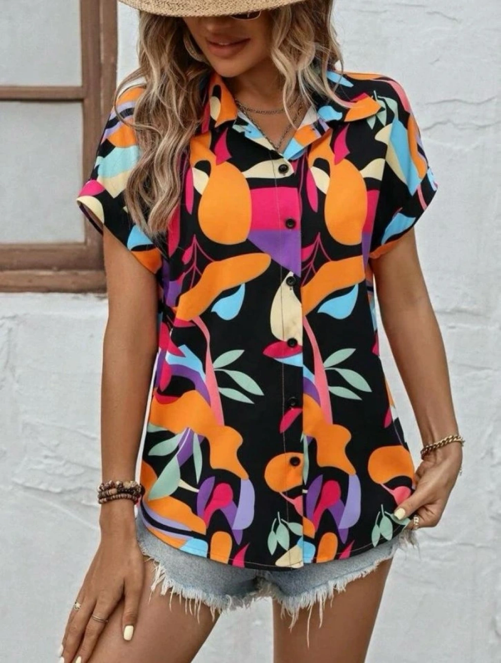 Kadın Moss Krep Kumaş Kısa Kol Çiçek Desenli Gömlek