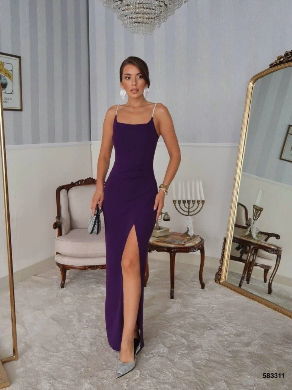 Kadın Omuz Askılı Derin Yırtmaç Detay Maxi Boy Elbise