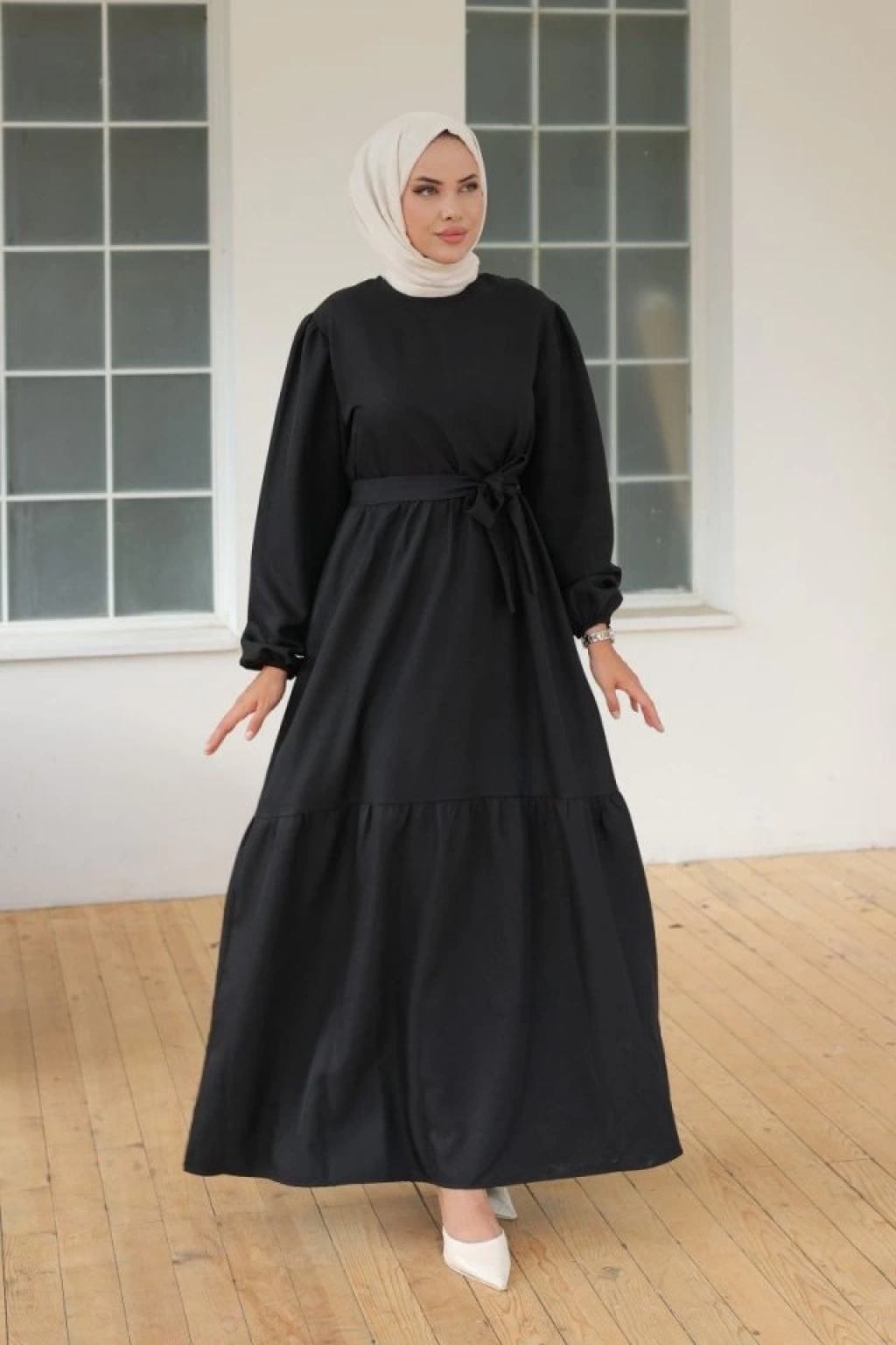 Kadın Uzun Kol Bisiklet Yaka Belden Bağlamalı Elbise