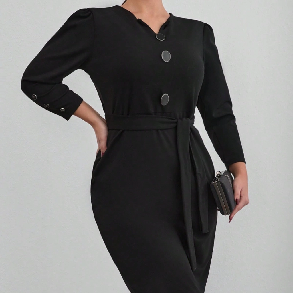 Kadın Uzun Kollu Düğme Detaylı Kendinden Kemerli Ithal Krep Elbise