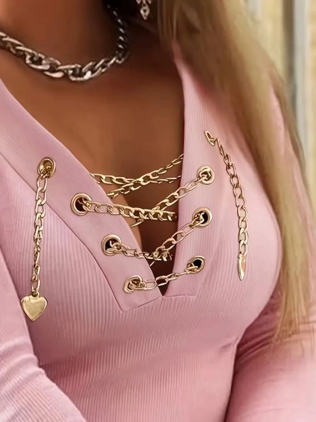 Kadın Uzun Kollu V çapraz Zincir Detaylı Kaşkorse Bluz
