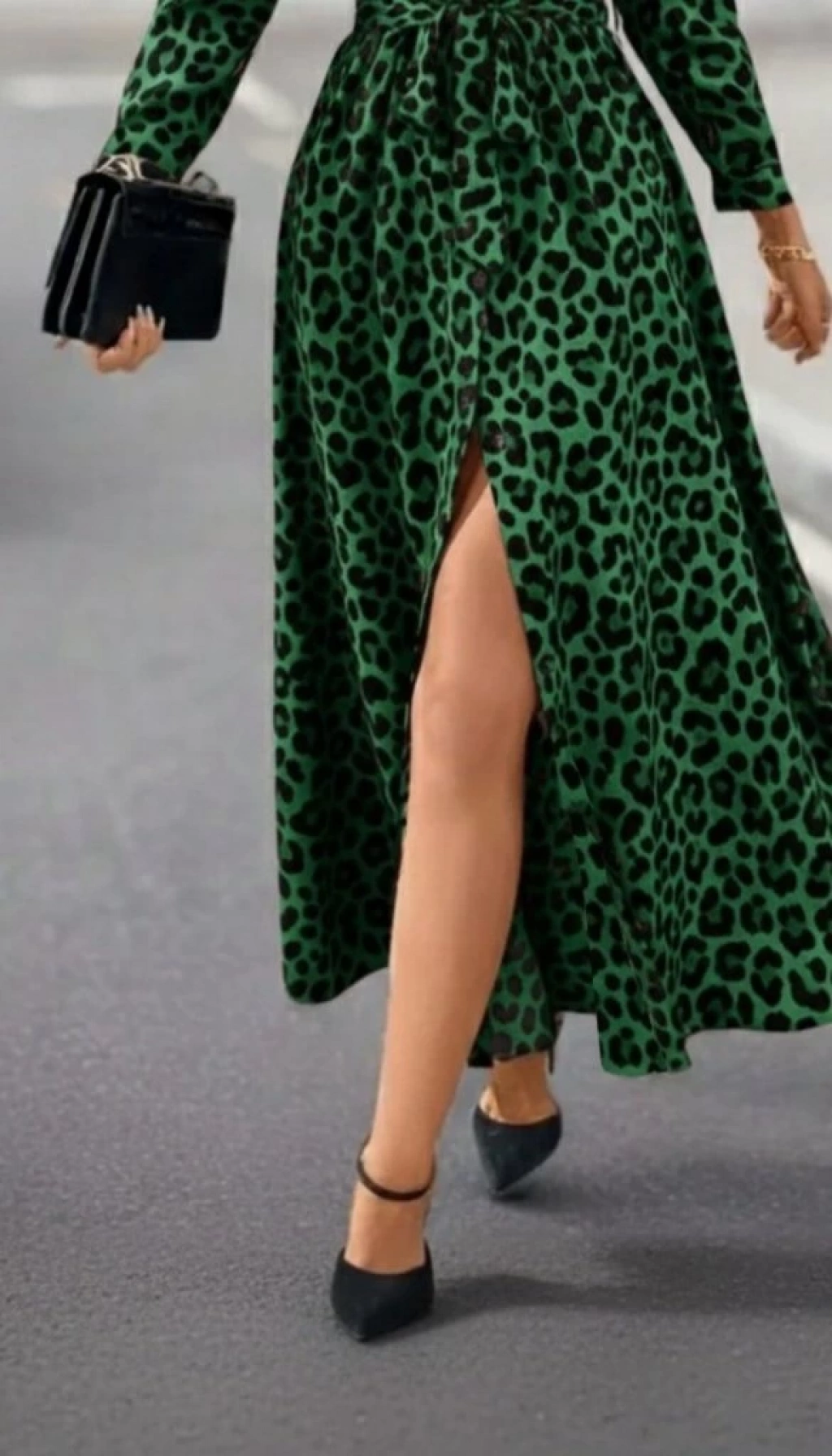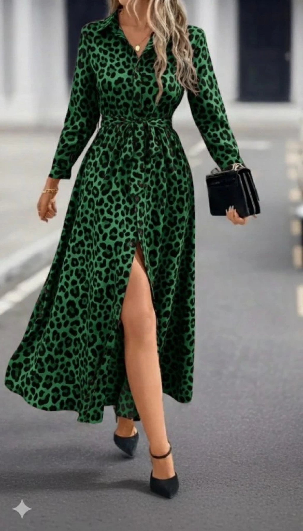 Kadın Uzun Kollu Yakalı Belden Kuşaklı Leopar Desenli Modal Uzun Elbise