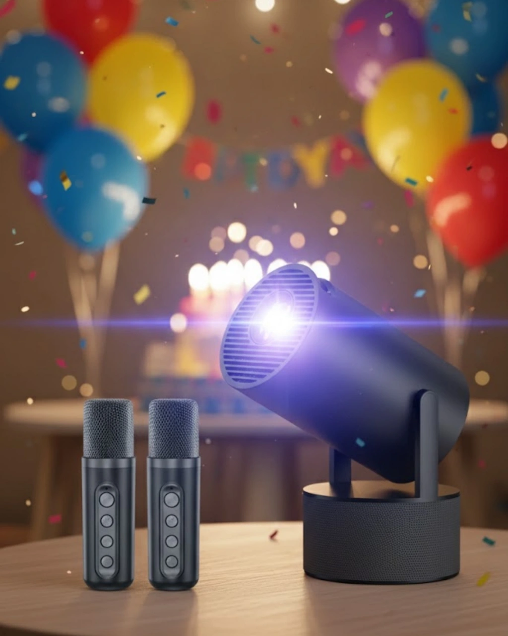 Siyah fişli karaoke projeksiyon cihazı, ev eğlencesini sosyal bir deneyime dönüştüren güçlü bir multimedya sistemidir. Yüksek çözünürlüklü projeksiyon teknolojisi ile geniş ekran görüntü sunarken, çift kablosuz mikrofon sistemi sayesinde gerçek bir karaoke sahnesi atmosferi oluşturur.Karaoke özelliği, cihazın en önemli avantajlarından biridir. İki mikrofon desteği ile aynı anda iki kişi şarkı söyleyebilir. Bu özellik özellikle düet performansları ve grup eğlenceleri için büyük kolaylık sağlar. Mikrofonlar net ses iletimi sunar ve hoparlör sistemi ile uyumlu çalışarak yüksek kaliteli ses deneyimi oluşturur.Dahili Bluetooth hoparlör, güçlü bas ve dengeli tiz performansı sunar. Hem müzik dinleme hem karaoke hem de film izleme sırasında etkileyici bir ses deneyimi sağlar. 1080P çözünürlük sayesinde şarkı sözleri ve müzik videoları net ve canlı şekilde yansıtılır.180° dönebilen projeksiyon başlığı farklı yüzeylere yansıtma imkanı sunar. Duvar, perde veya tavan kullanımı mümkündür. Fişli tasarımı sayesinde uzun süreli ve kesintisiz kullanım sağlar.WiFi ve Bluetooth bağlantı seçenekleri sayesinde telefon, tablet ve diğer cihazlarla kolay entegrasyon sunar. USB ve HDMI girişleri ile farklı medya kaynakları bağlanabilir.Modern siyah tasarımı ile estetik görünüm sunan bu karaoke projeksiyon sistemi, ev partileri, doğum günleri ve aile eğlenceleri için ideal bir çözümdür.