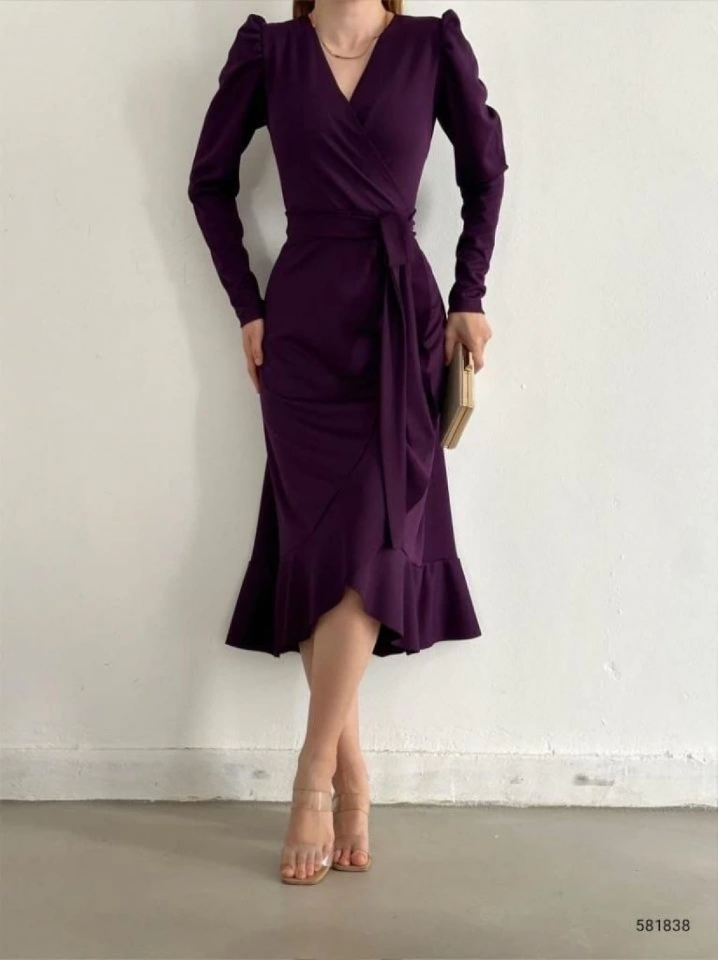 Krep Kumaş Midi Boy Kuşaklı Uzunkol Elbise