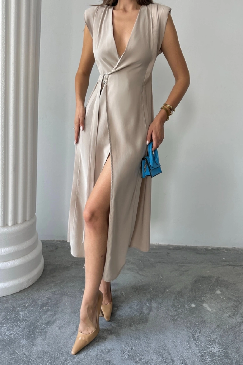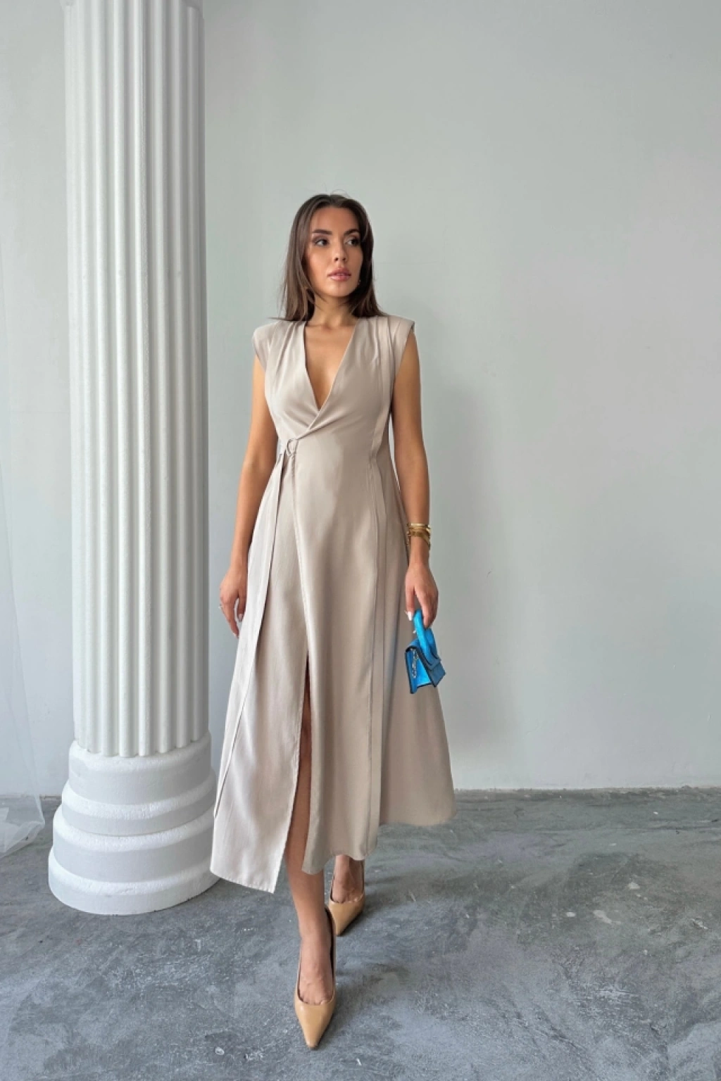 KRUVAZE VATKALI KOLSUZ ELBİSE MODAL KUMAŞ - Bej