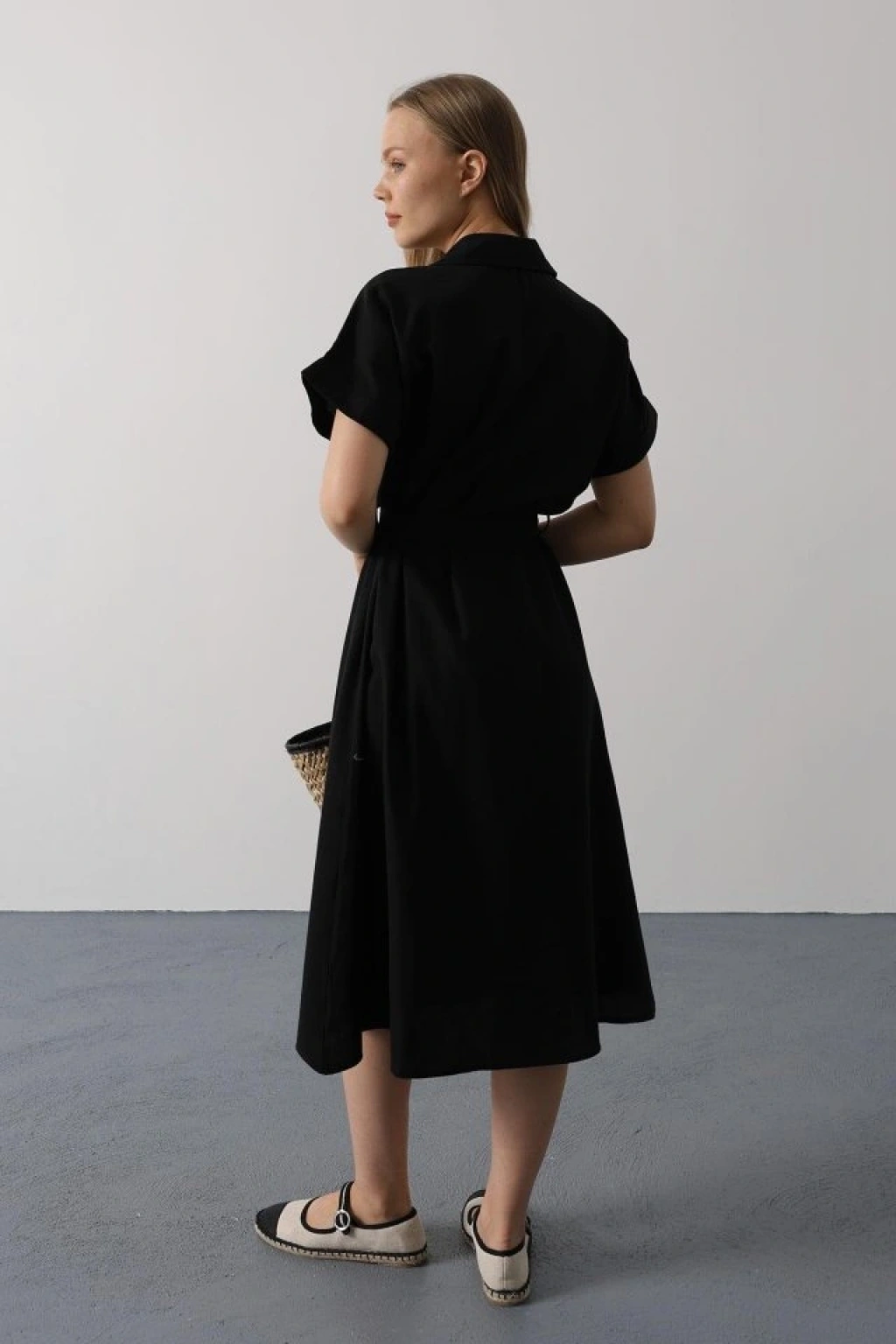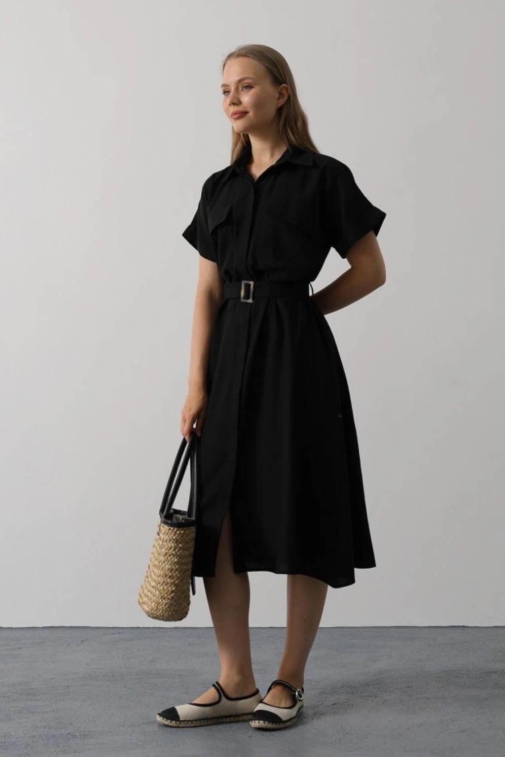 Kuşaklı Cep Detaylı Yarım Kol Elbise - Siyah