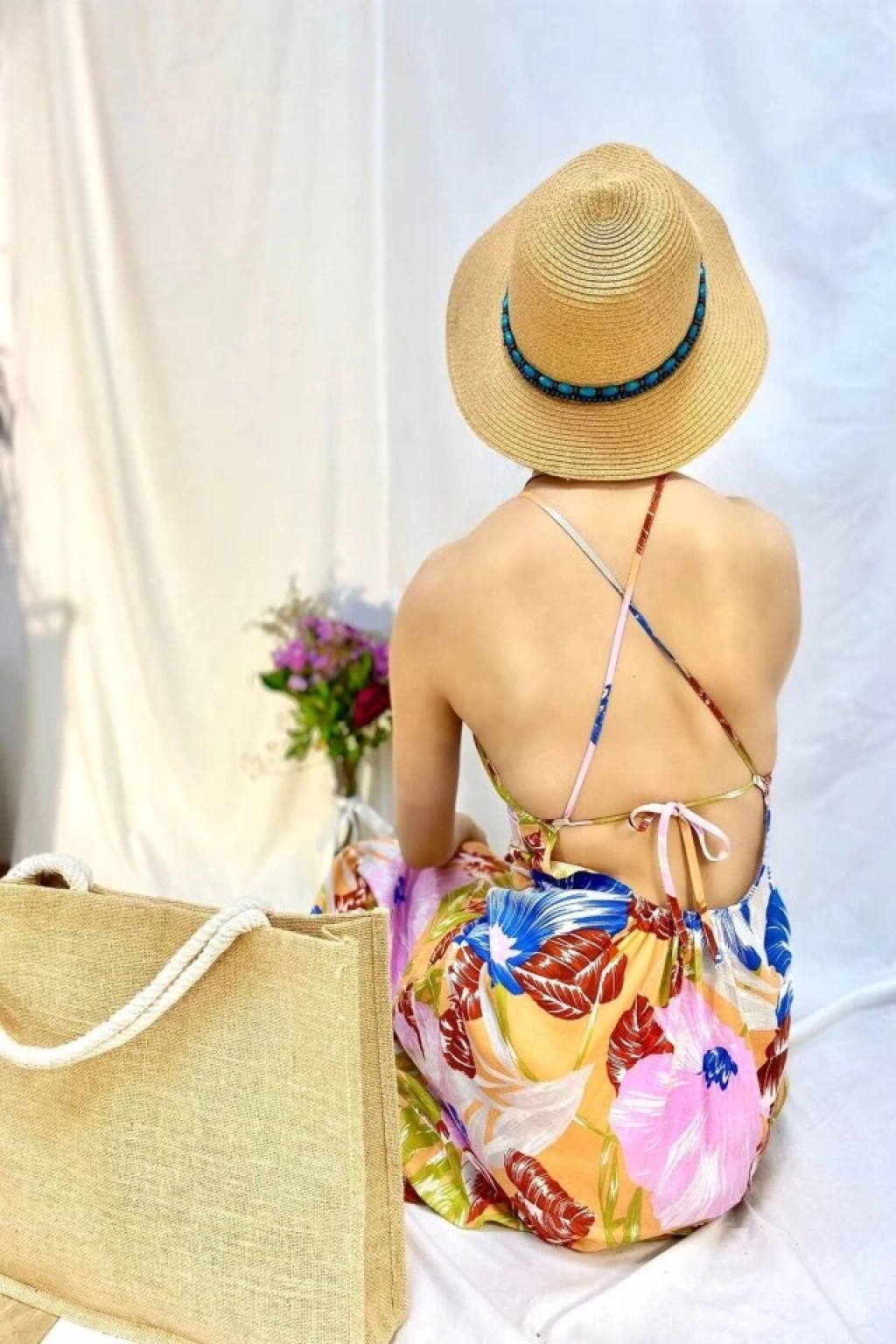Mavi Sırt Dekolteli Keten Elbise