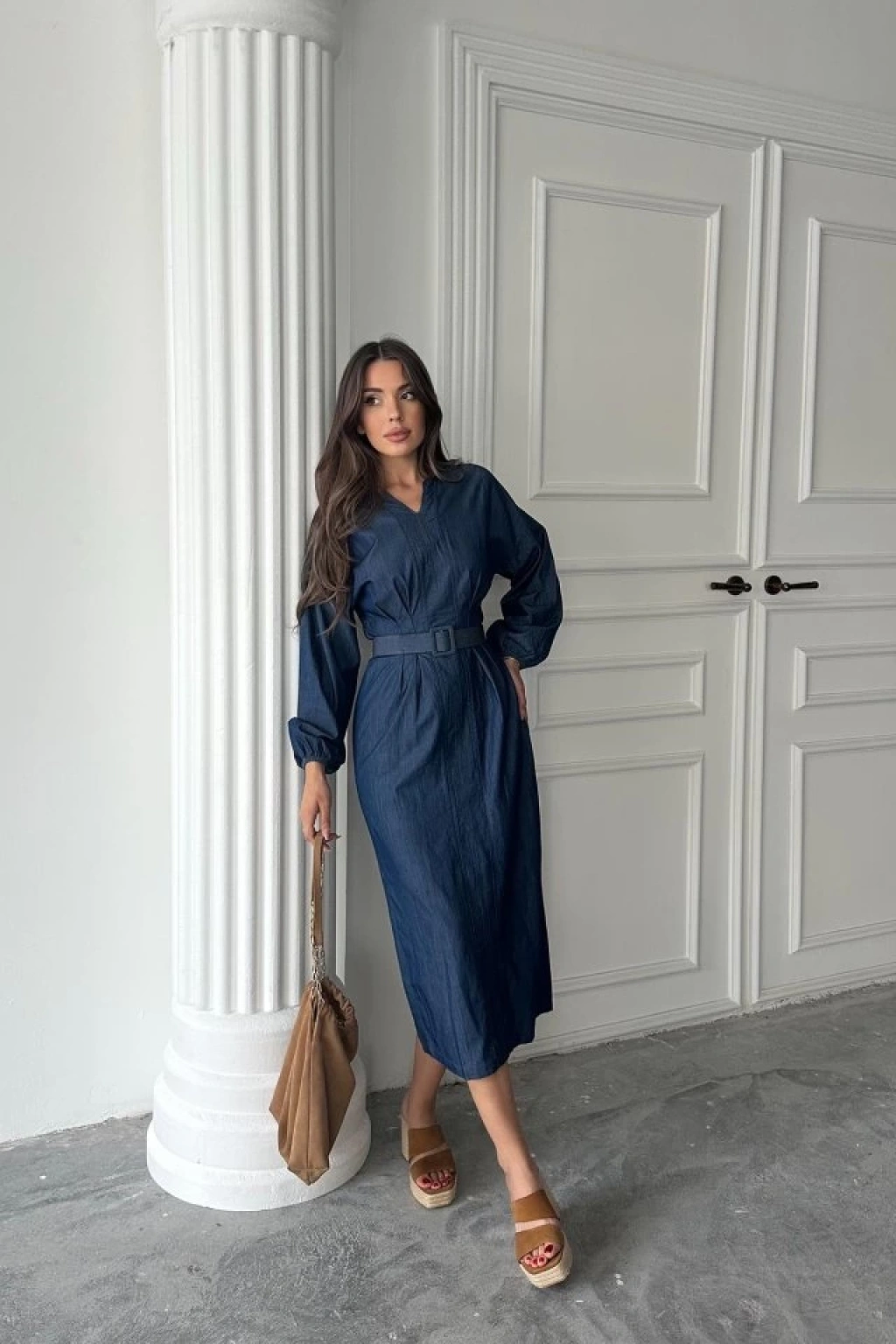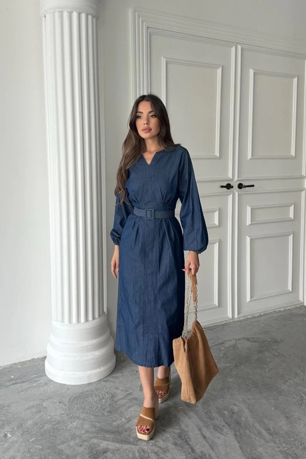 Mavi Tencel Uzun Kollu Elbise