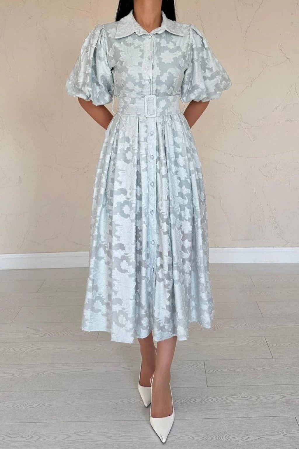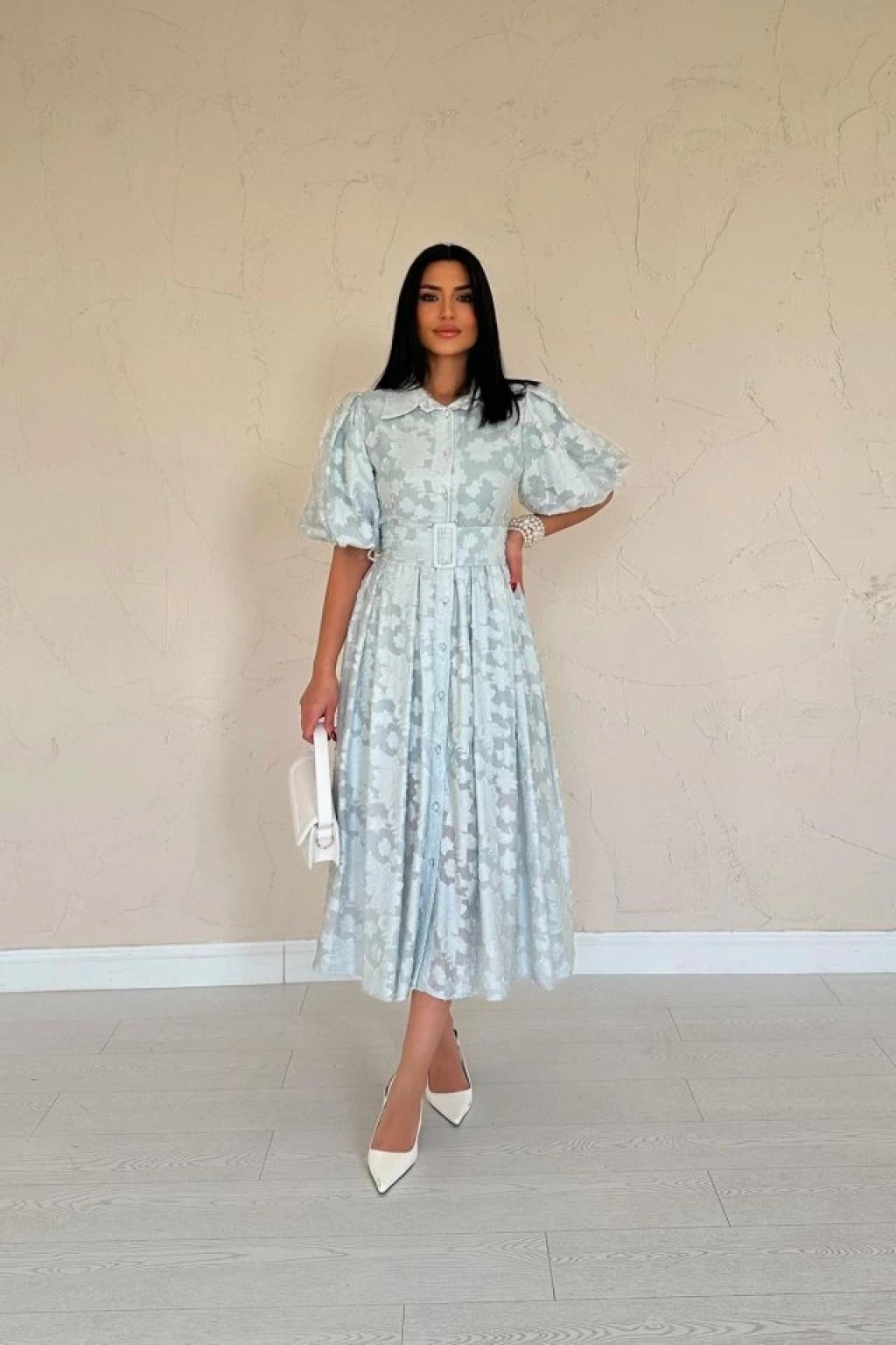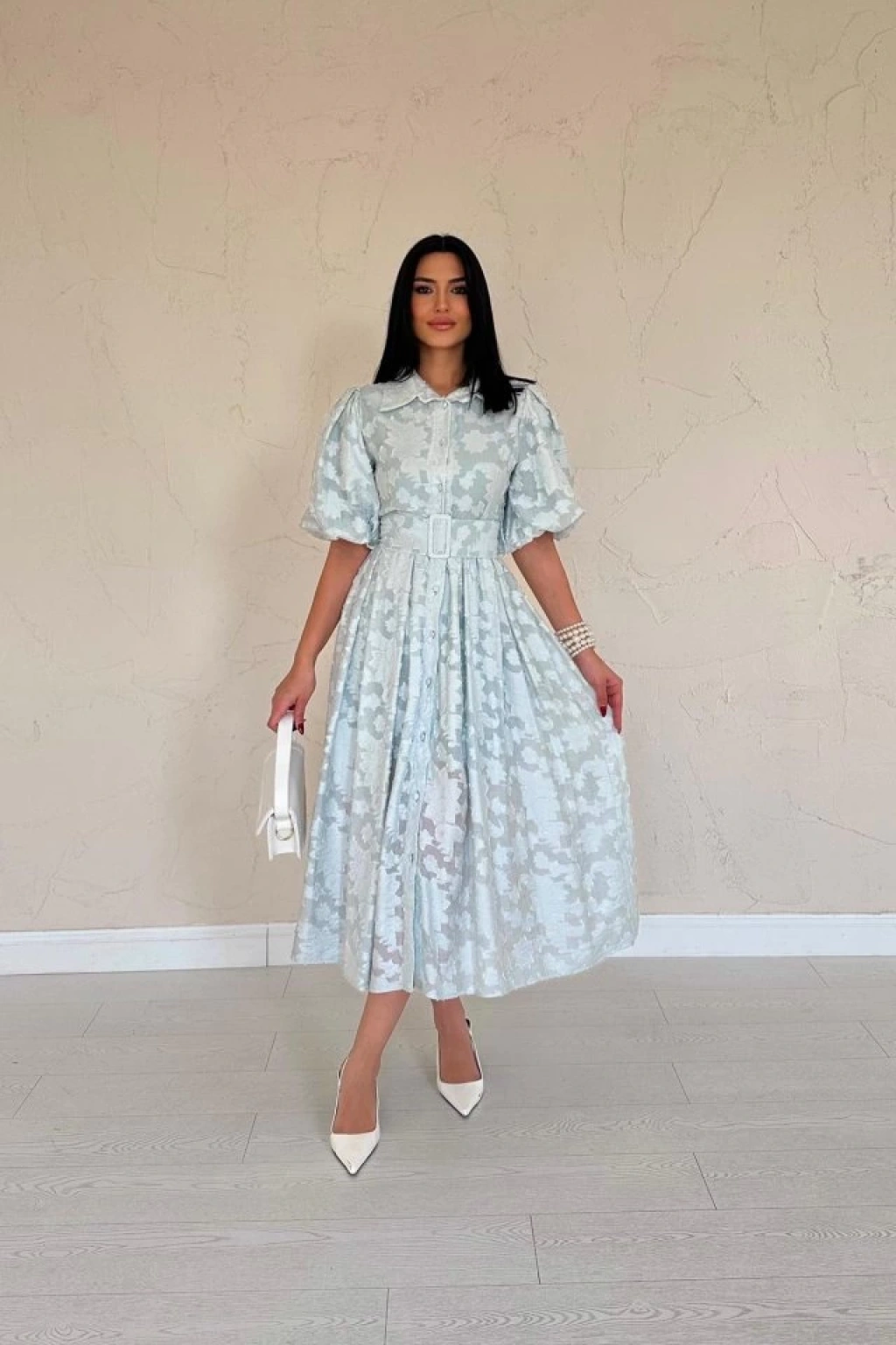 Mint Kemerli Balon Kollu Elbise