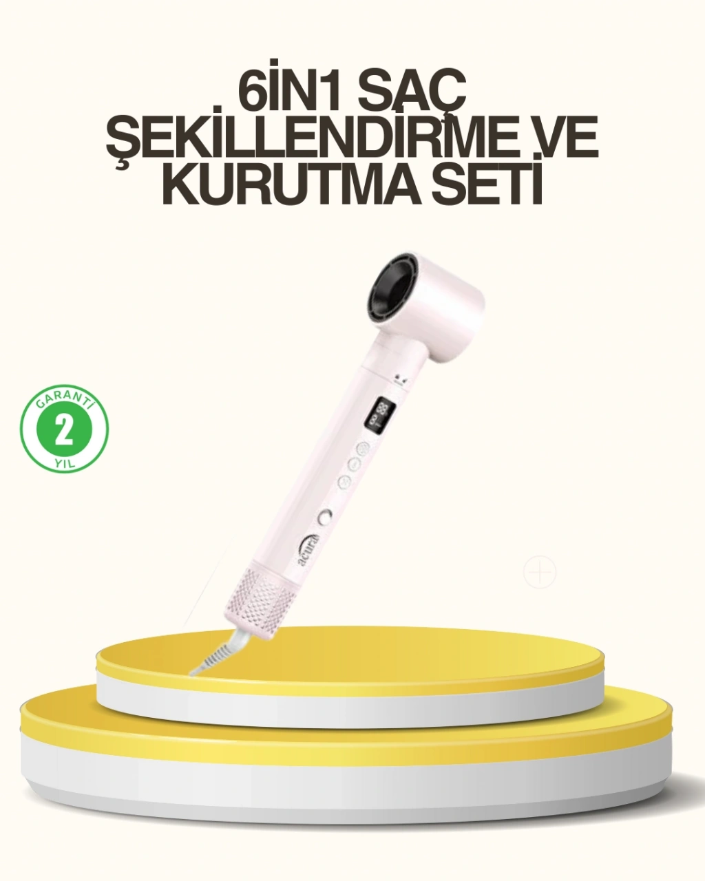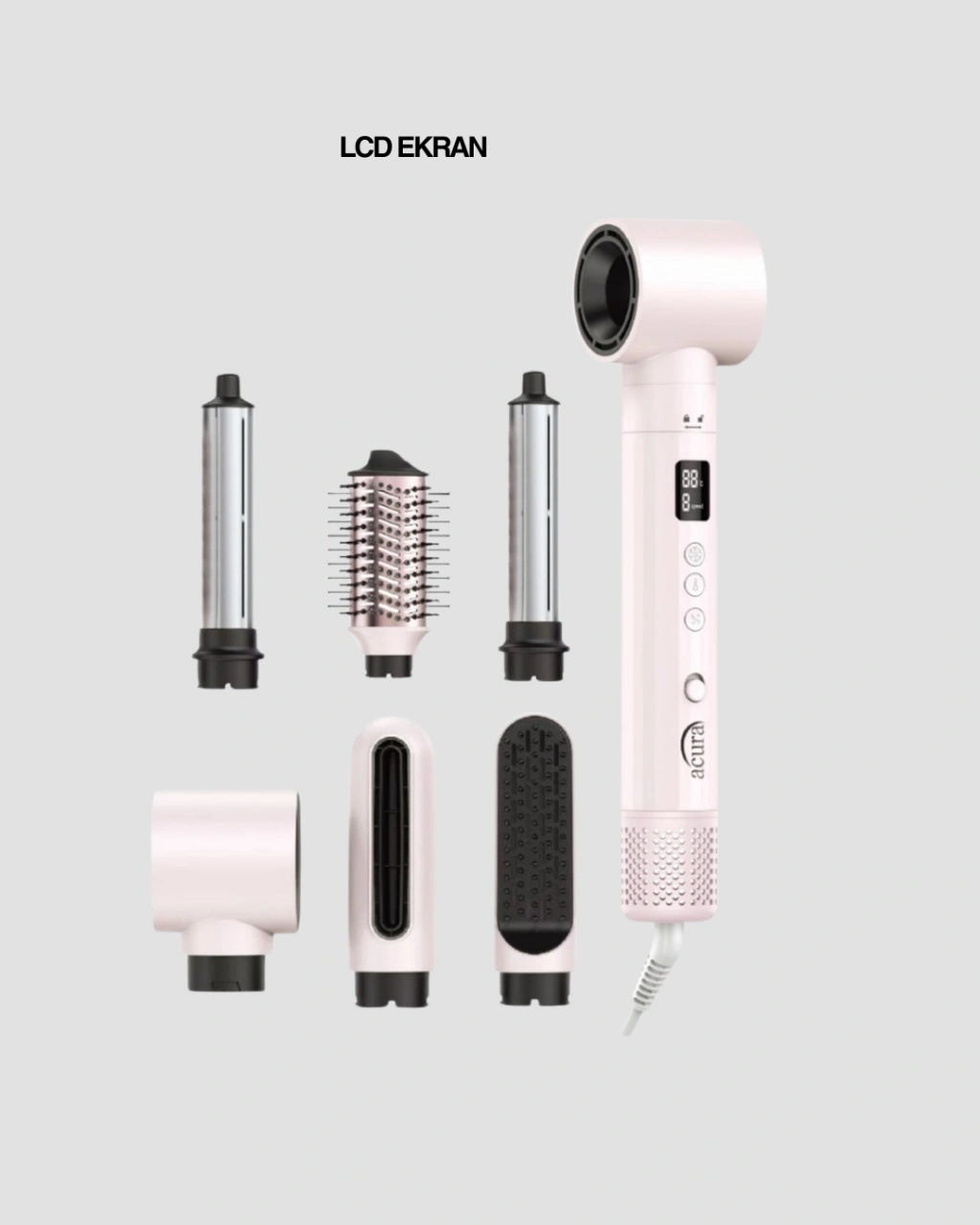 Acura AC-95 Airstyle 6-in-1 Saç Şekillendirme Seti, teknolojiyi saç bakım rutininize entegre eden yenilikçi bir üründür. Gelişmiş motor yapısı ve akıllı ısı kontrol sistemi sayesinde saçlarınıza zarar vermeden etkili sonuçlar elde etmenizi sağlar.110.000 rpm motor hızı, güçlü fakat dengeli hava akışı sunarak saçların hızlı şekilde kurumasına yardımcı olur. Bu sayede saç telleri yüksek ısıya uzun süre maruz kalmaz ve doğal yapısını korur. Negatif iyon teknolojisi, saç kütikülünü kapatarak parlaklık ve yumuşaklık kazandırır.LCD ekranlı kontrol paneli, kullanım sırasında anlık bilgi sunar. 3 kademeli sıcaklık ve hız ayarı, farklı saç tiplerine uygun kişisel ayarlamalar yapmanıza olanak tanır. Akıllı ısı kontrolü, saçın aşırı ısınmasını önleyerek kırılma ve kuruma riskini azaltır.Çoklu başlık seçenekleri, cihazın kullanım alanını genişletir. Bukle başlıkları ile hacimli ve doğal dalgalar, düzleştirme fırçası ile pürüzsüz saçlar elde edilebilir. Hacimlendirici fırça, saç diplerinden itibaren dolgun bir görünüm sunar.Soğuk üfleme özelliği, şekillendirme işlemi sonrasında saçın formunu sabitlemeye yardımcı olur. Ergonomik tasarımı ve hafif yapısı, uzun süreli kullanımlarda konfor sağlar. Evde profesyonel saç şekillendirme deneyimi yaşamak isteyenler için ideal bir settir.2 yıl garanti desteği ile sunulan bu ürün, güvenli ve uzun ömürlü kullanım sağlar. Günlük saç bakımını pratik hale getirirken estetik sonuçlar elde etmenizi mümkün kılar.