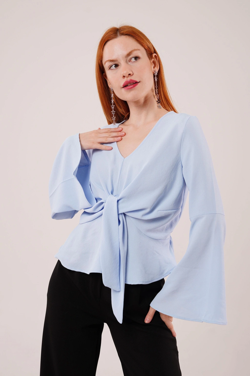 Ön Bağlamalı Volan Kol Bebe Mavisi Bluz