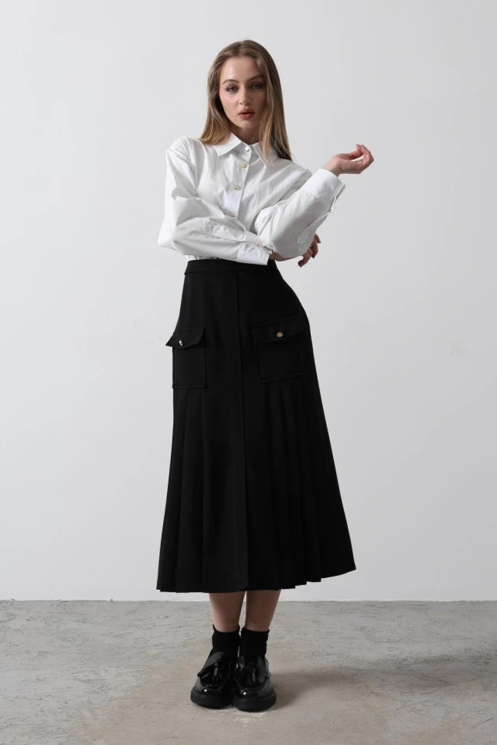 Pileli Kontrast Gömlek Elbise - Beyaz