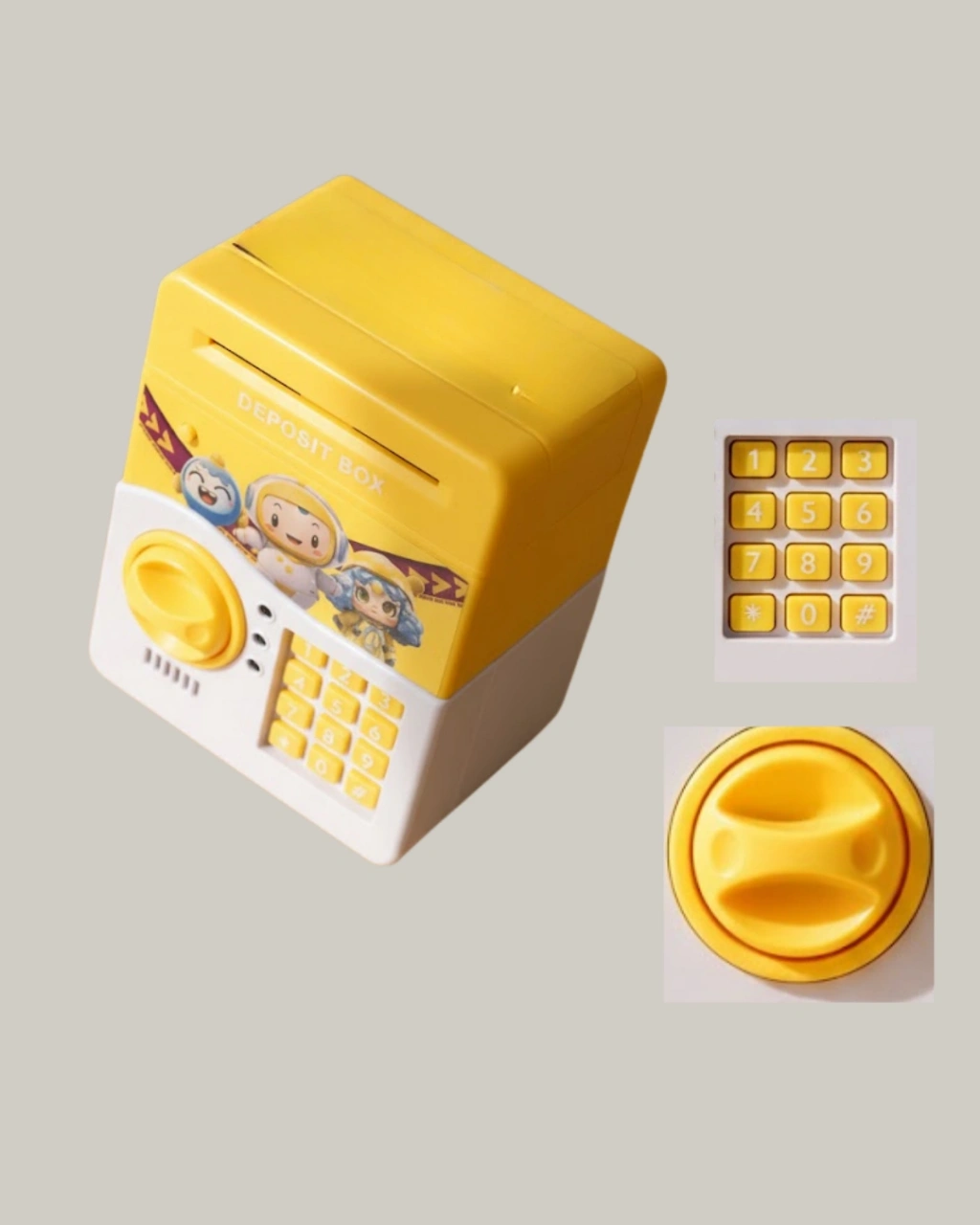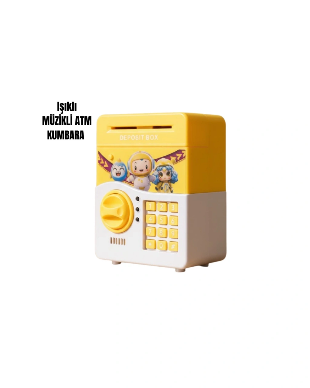 Bu sarı renkli elektronik şifreli kumbara, çocukların para biriktirmeyi severek öğrenmesini sağlar. ATM tasarımı, otomatik para çekme özelliği ve ışıklı-sesli efektleri ile dikkat çeker.Kişisel şifre sistemi, güvenli kullanım sunar. Yüksek kapasiteli iç hacmi sayesinde bol miktarda para saklanabilir. Dayanıklı ABS plastikten üretilmiştir ve uzun ömürlüdür.