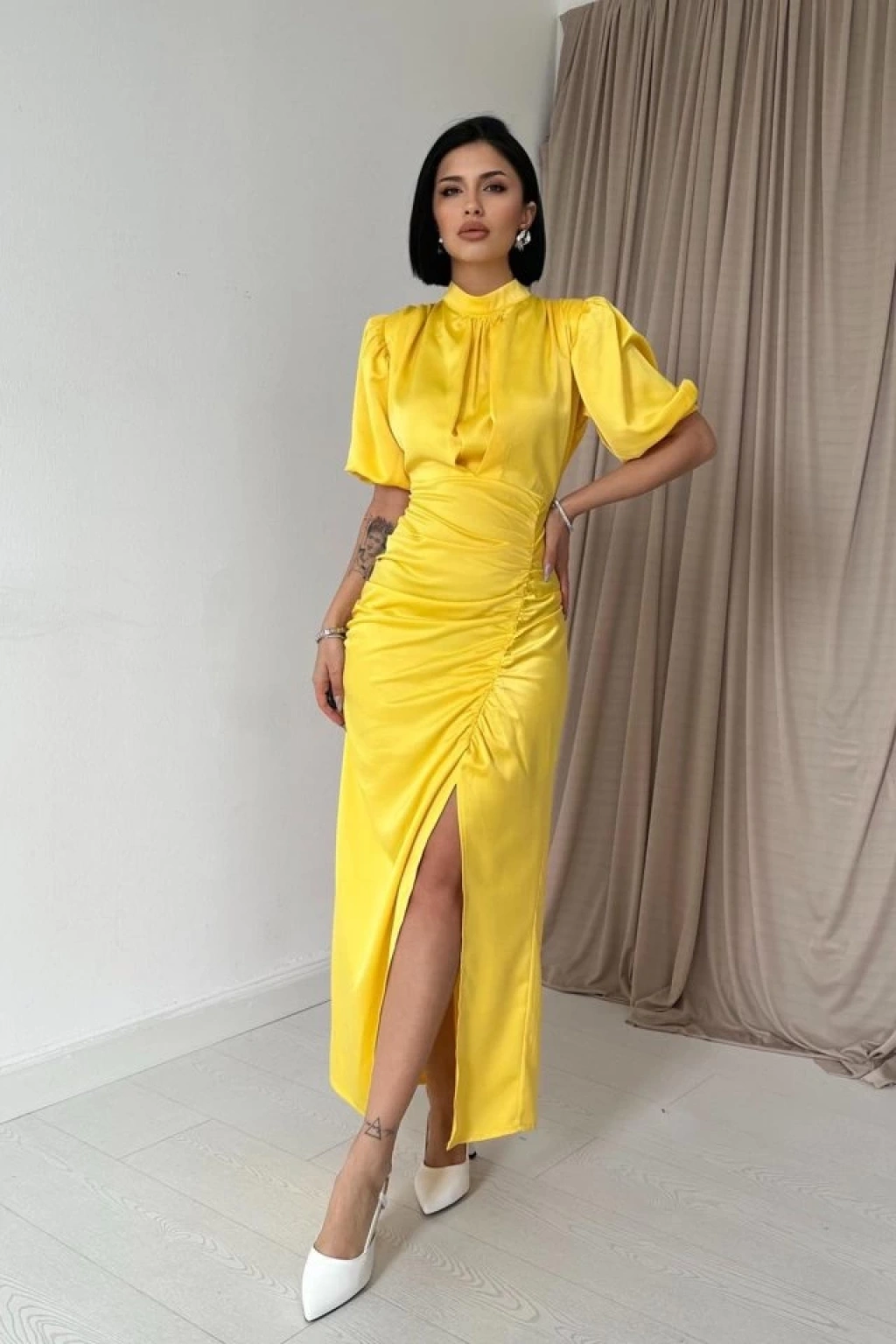 Sarı Büzgülü Saten Elbise