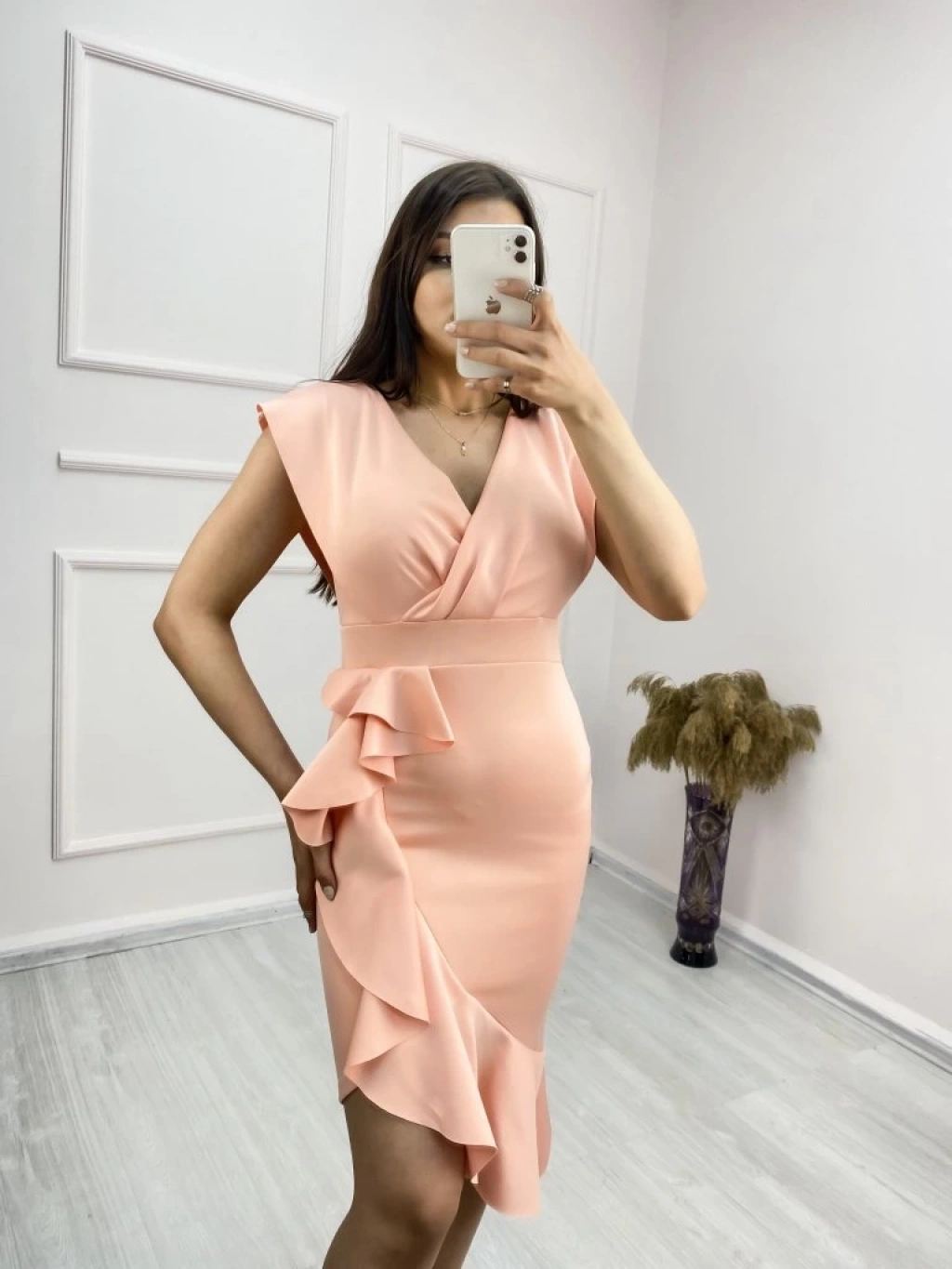 Scuba Kumaş Önü Fırfırlı Midi Boy Elbise