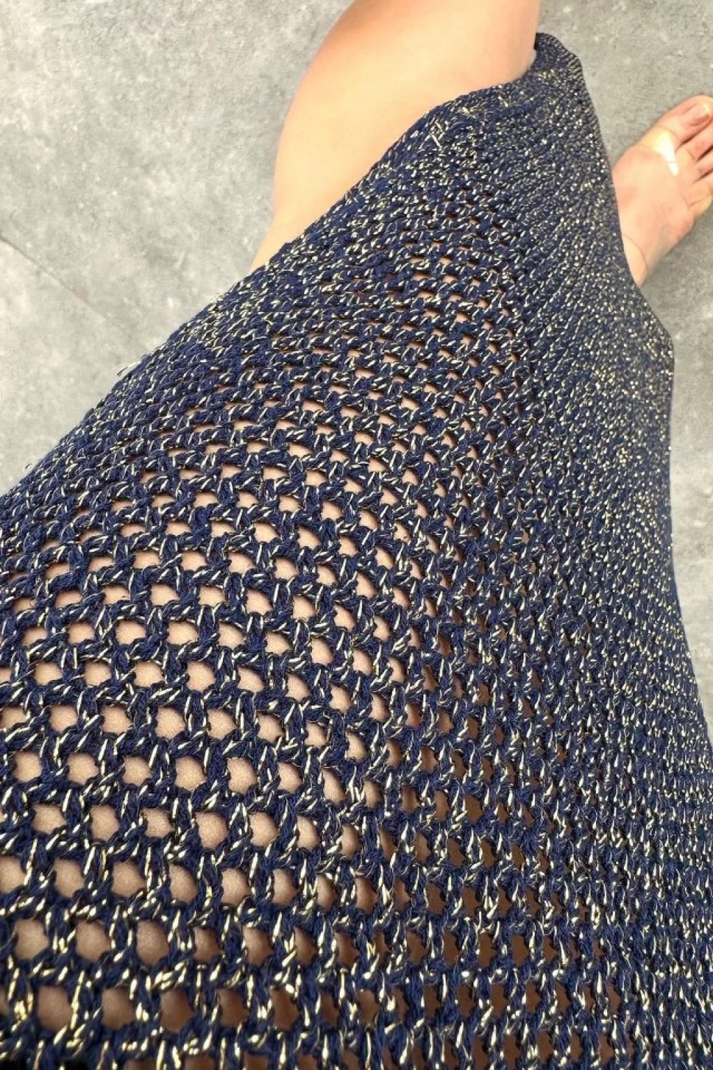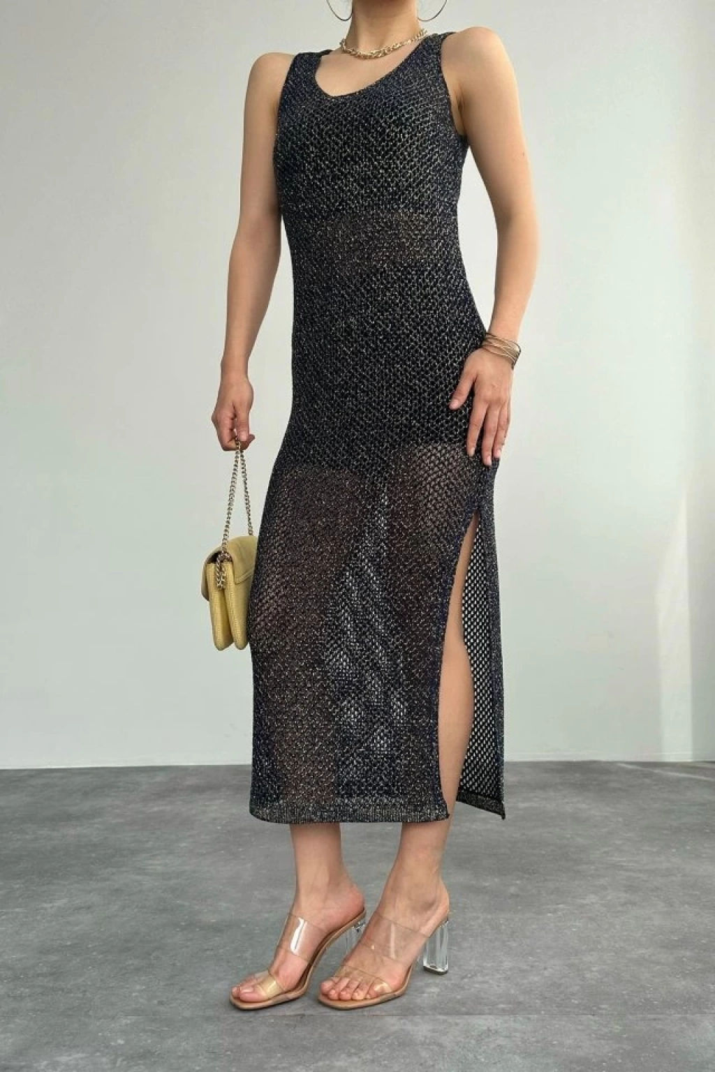Simli Ajurlu Uzun Elbise - Lacivert-Sarı